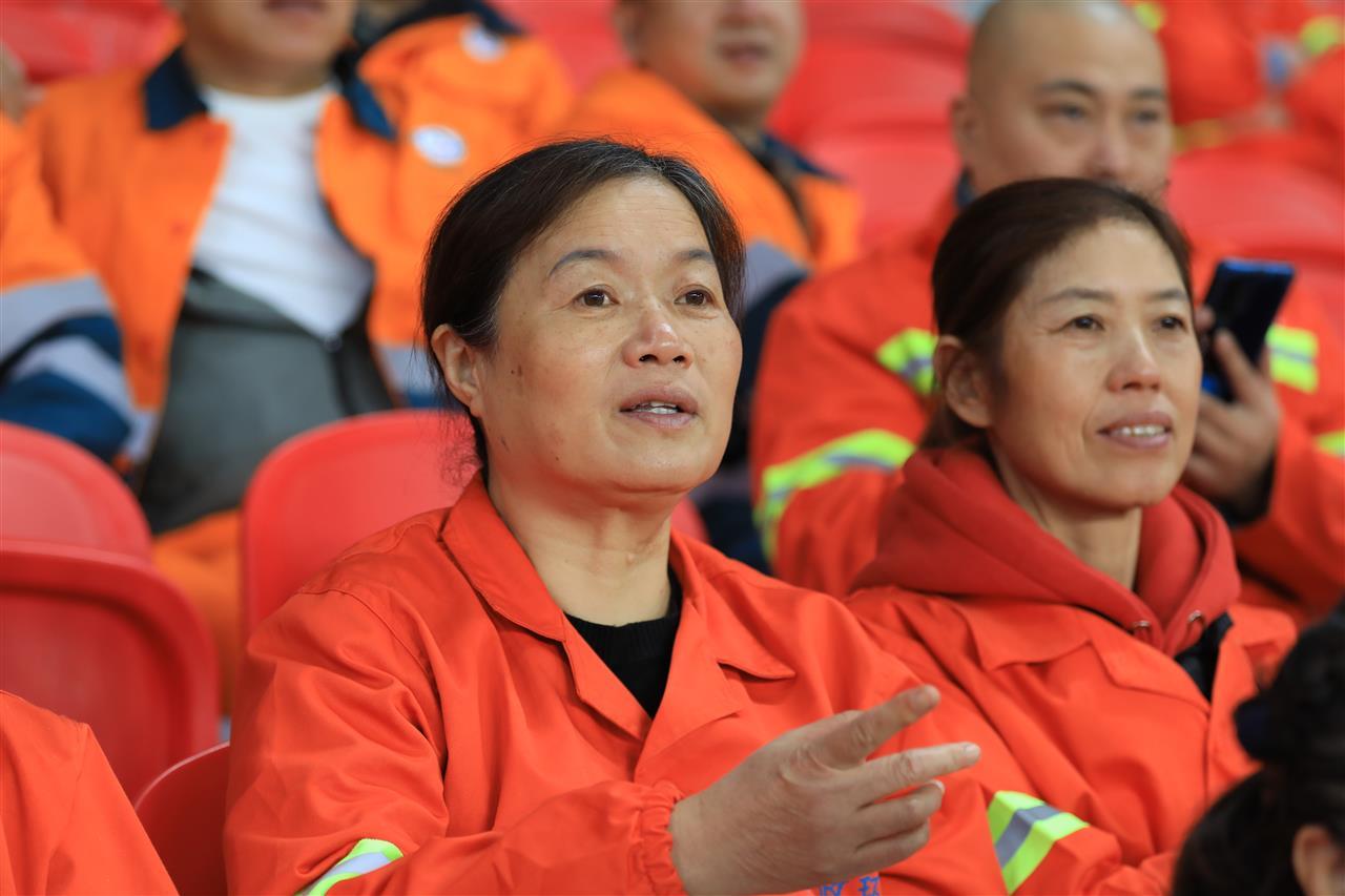 10月24日晚,武汉体育中心灯火通明,气氛热烈。2025赛季中超联赛第28轮武汉三镇主场在这里对阵深圳新鹏城。为迎接即将到来的环卫工人节,致敬常年奋战在城市一线的“城市美容师”,武汉市委宣传部、市文明办联合市城管执法委、武汉三镇足球俱乐部共同举办“为热爱呐喊,为文明点赞”公益观赛活动。来自武昌区、东西湖区、武汉经开区的200名环卫工人代表受邀观看本场中超联赛,共同感受足球激情,共享城市文明成果。