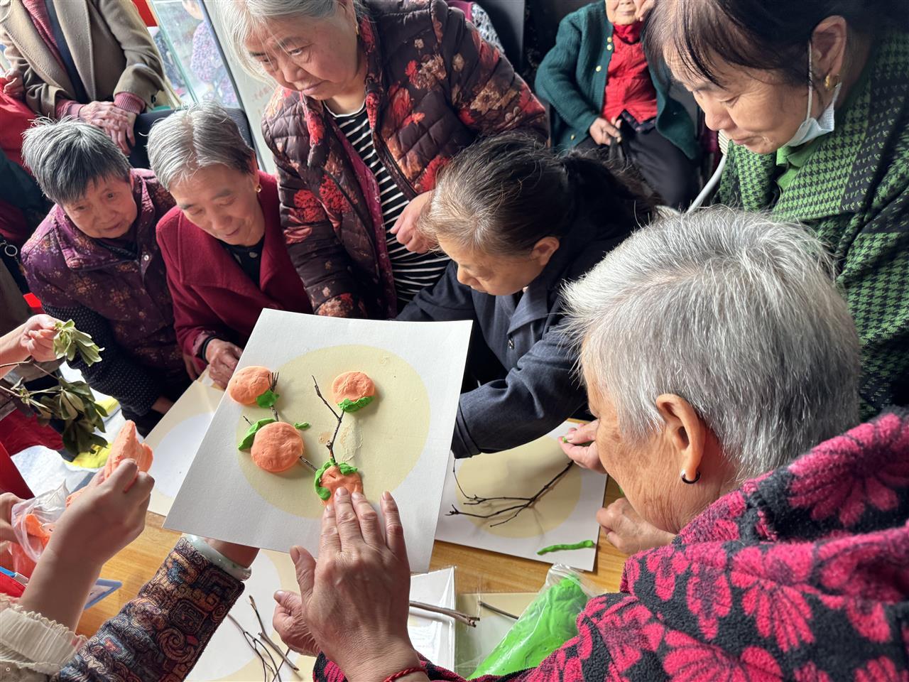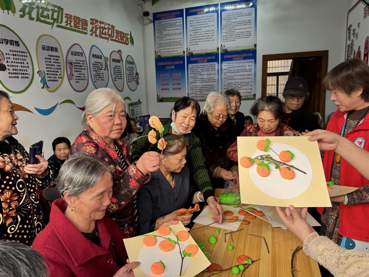 活动快结束时,老人们捧着自己做的“柿子”挂饰,挤在镜头前合影。阳光透过窗户洒在她们脸上,皱纹里都带着笑。