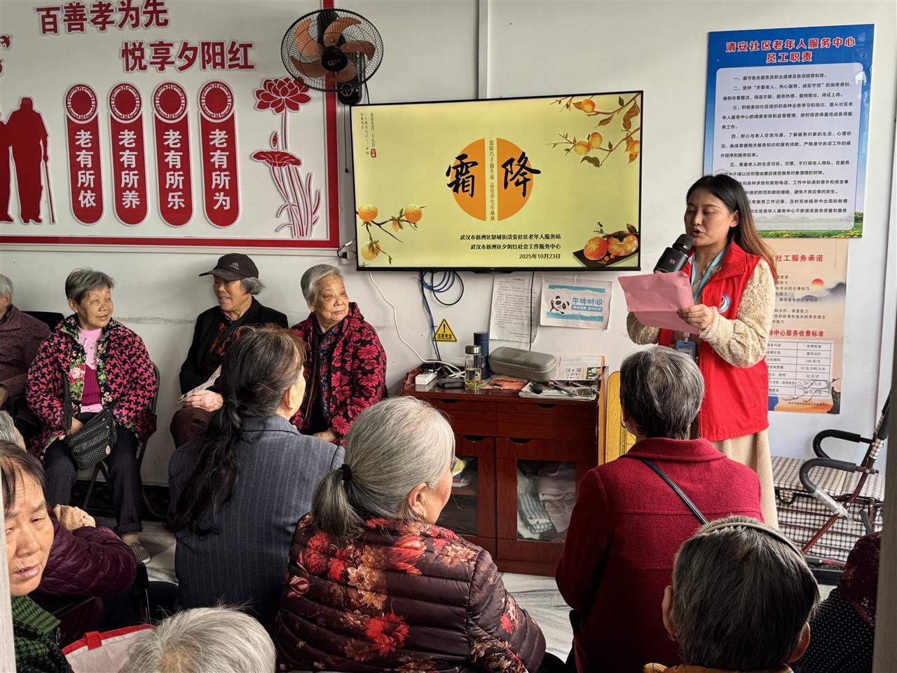 在霜降知识小课堂上,志愿者指尖划过PPT,屏幕上“霜降三候”的插画活灵活现,配上老师接地气的讲解,老人们听得格外认真。