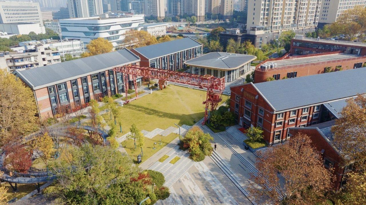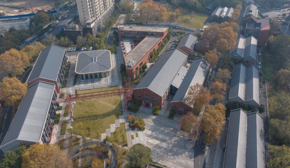 傍晚时分,站在小龟山的制高点俯瞰,红砖建筑在夕阳下格外醒目,梧桐树影斑驳如旧,园区中间的小广场上,有人站在龙门吊下拍照打卡。