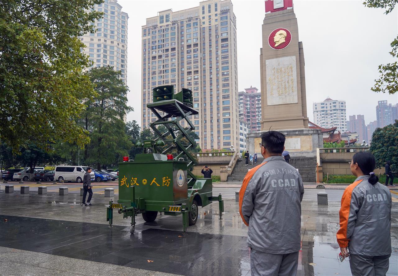 警钟长鸣,吾辈自强!10月25日下午4时,一声声肃穆的防空警报声响彻武汉三镇。在汉口江滩的武汉防汛纪念碑前,一台移动式升降电声警报车静静停放。细雨没有阻挡市民的脚步。从汉阳驱车赶来的吴先生,带着10岁的儿子和父母一起聆听警报。“作为武汉人,我们要铭记历史,也要让孩子接受教育。”他说。