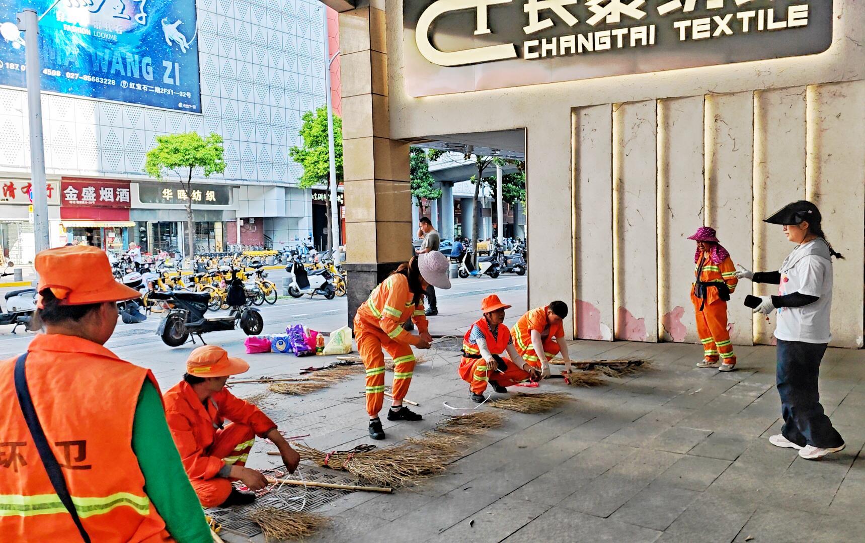 在商居密集、街巷众多、垃圾日产量和日常保洁难度较大的汉正街道,街道组织环卫工人开展“扎扫帚、除牛皮癣”等技能竞赛活动,庆祝环卫工人节,引来众多商家和行人驻足观看。
