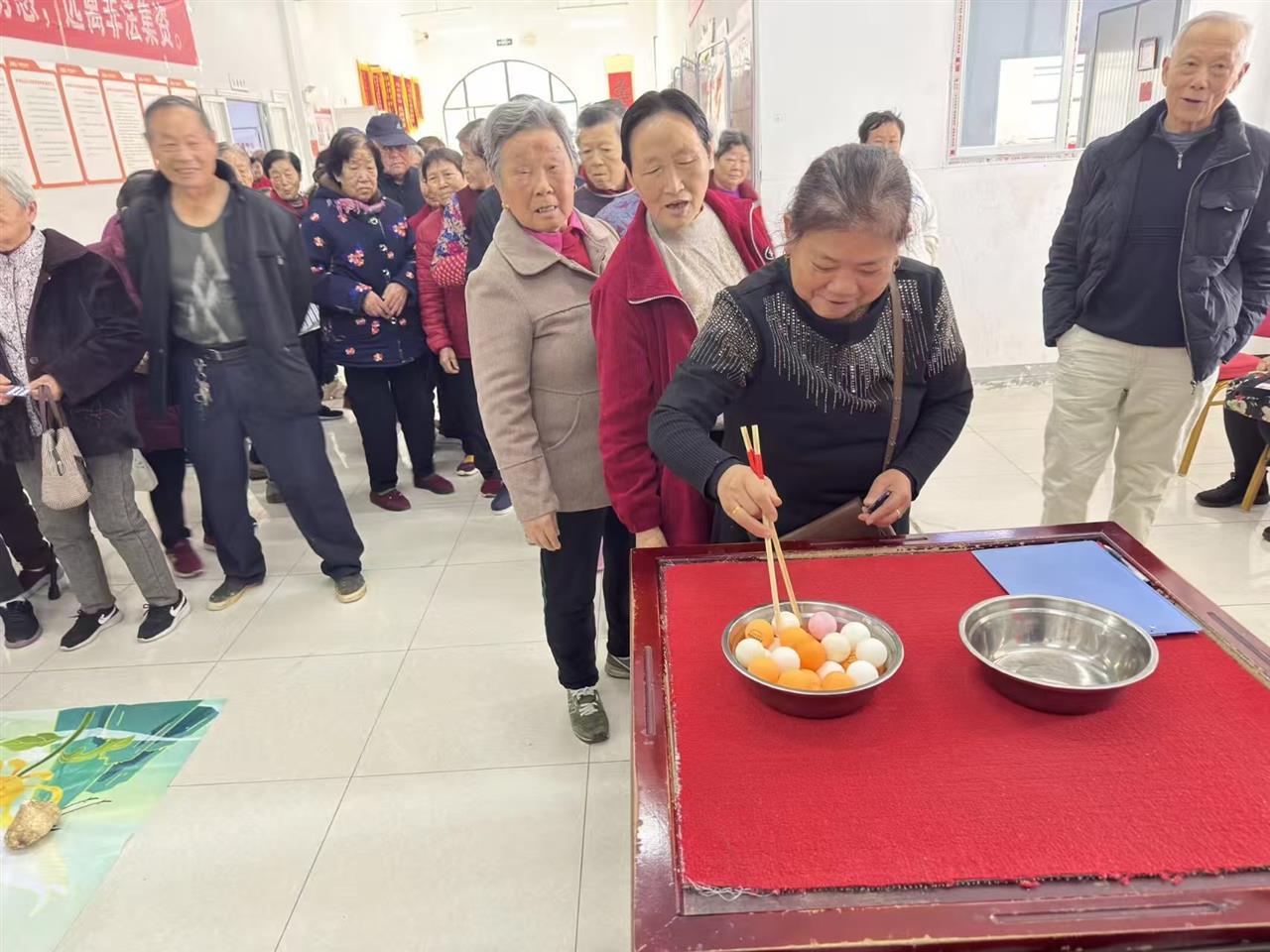 老人活动中心内热闹非凡,“情暖金秋 耆乐游园”活动专为偏好就近参与的邻里长辈打造。“圈住重阳福”套蔬菜、“夹起好时光”夹乒乓、“投中重阳礼”投飞镖三个趣味游戏前,老人们排起长队,瞄准投掷、专注夹球、精准投镖,现场欢呼声与笑声不断。
