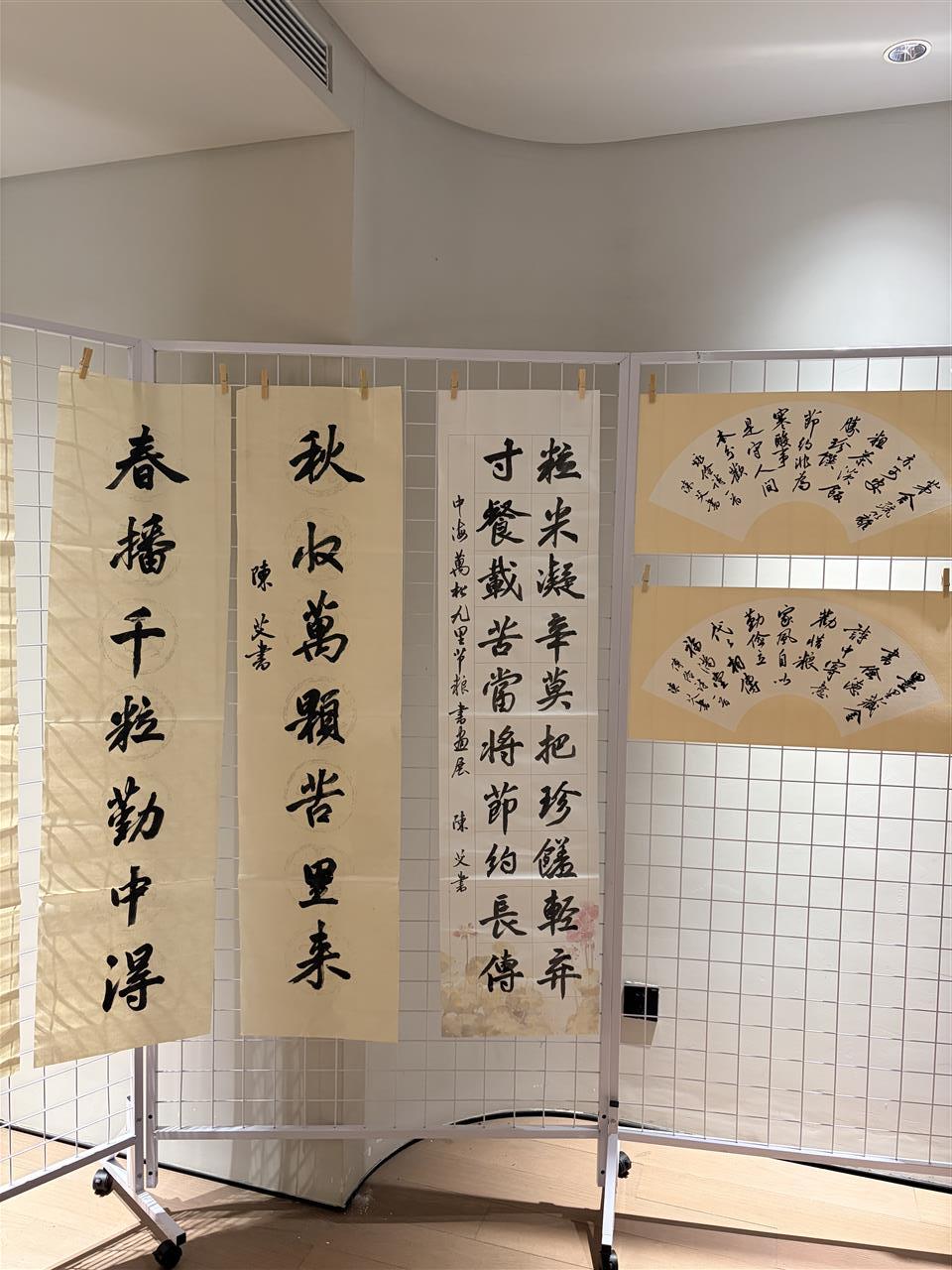 “倡导节俭美德”板块则以斗方扇面的书法形式呈现。陈艾先生创作了一幅幅以节俭为美的书法精品,其中不乏寓意深刻的诗词佳作。《咏节俭》中“茅舍疏篱亦可安,粗茶淡饭胜珍馔,节约非为寒酸事,是守人间本分欢”,传达出一种淡泊名利、安于简朴的生活态度;《传节俭》“墨里藏金书俭德,诗中寄意劝惜粮。家风自以勤俭立,代代相传福满堂”,强调了节俭作为一种家风传承的重要性;《倡节俭》“不羡奢华慕简真,一餐一饭念艰辛。莫言小事不足道,美德从来在珍惜”,则从日常生活的点滴入手,呼吁居民从身边小事做起,践行节俭美德。