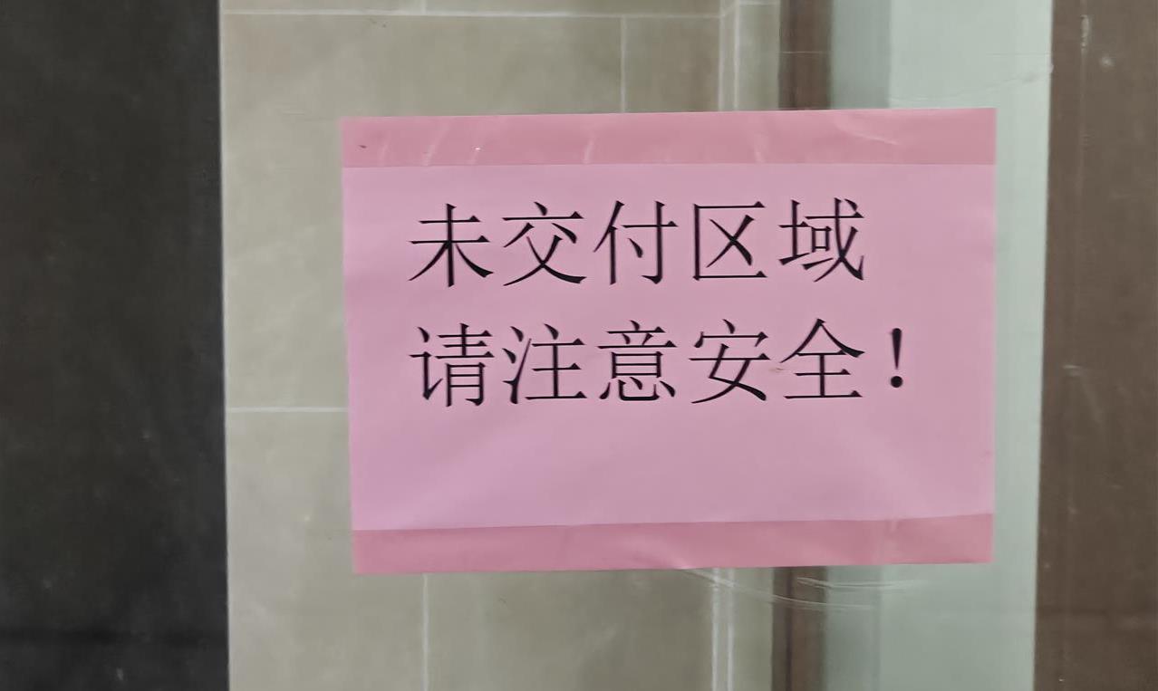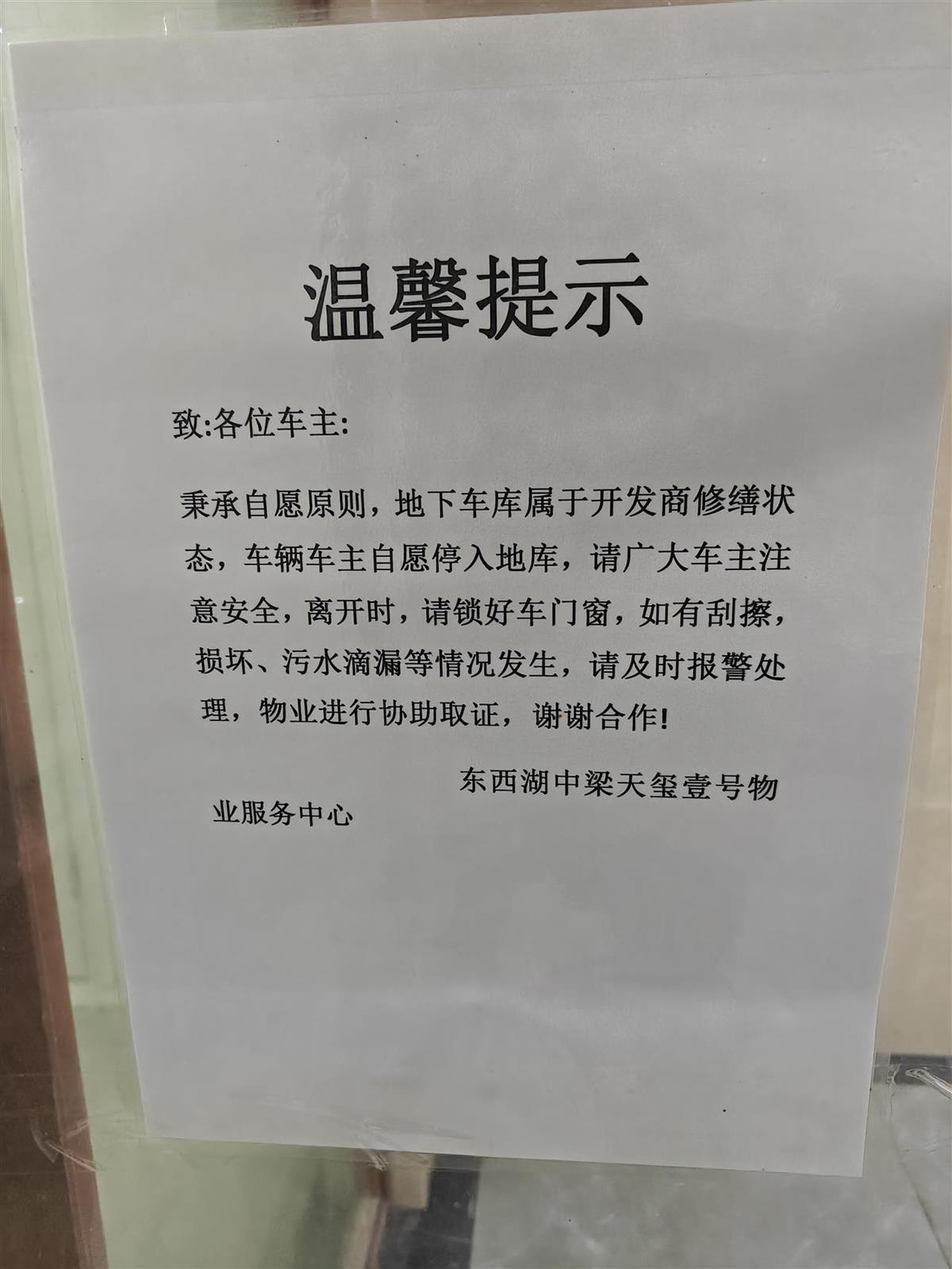 记者进入小区地下车库,刚走出电梯,车库玻璃门两侧张贴的两张告示格外显眼:左侧的白色告示纸上,“地下车库属于开发商修缮状态,车主自愿停放,请注意安全……”,右侧则用醒目的红色纸张标注着“未交付区域,请注意安全”。