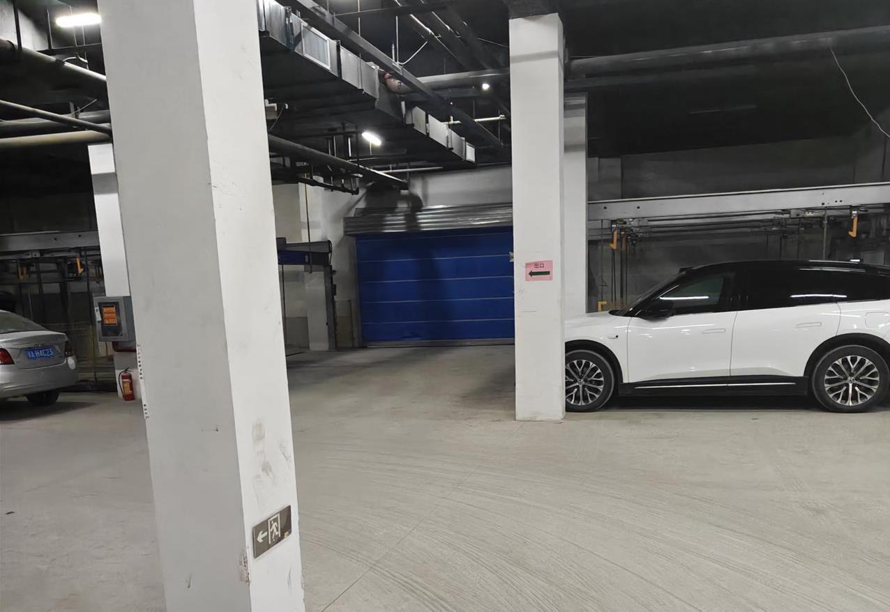 在昏暗的车库内,记者发现当时仅有少量车辆停放,大多数立体车位都处于闲置状态。部分区域被蓝色卷闸门封闭,无法进入,门上也未张贴任何开放时间提示。在车库的一些角落,还散落着少量施工材料。柱子上还贴着小心漏水的提示,整个车库并未完全开放。