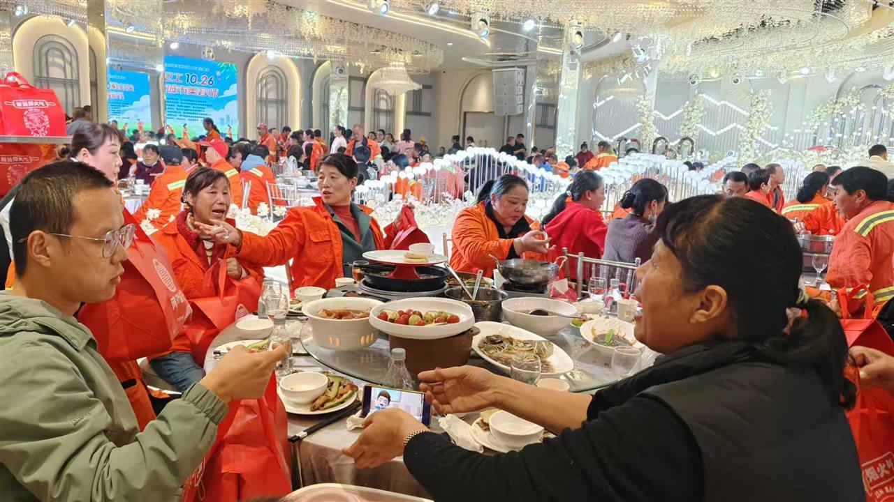 餐桌上,吊烧鹅、多宝鱼、羊肉锅、基围虾、红烧蹄髈等18道精心烹制的美食香气四溢,460名环卫工人一边品尝着美味佳肴,一边欣赏着精彩演出,现场欢声笑语不断。