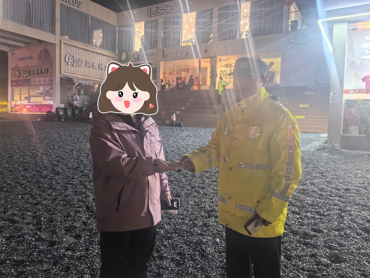 18时30分许,正在内场执勤的前川街环城派出所警力王治伟收到现场游客捡到的一张杨姓女士的身份证。现场人声鼎沸,杨女士可能都不知道自己的身份证已经遗失。王治伟一边上报信息,想要通过广播找到杨女士,一边尝试通过身份信息查询杨女士联系方式。联系上杨女士后大约十分钟后,其慌忙赶来,从民警手中拿到了丢失的证件,并对民警再三感谢。