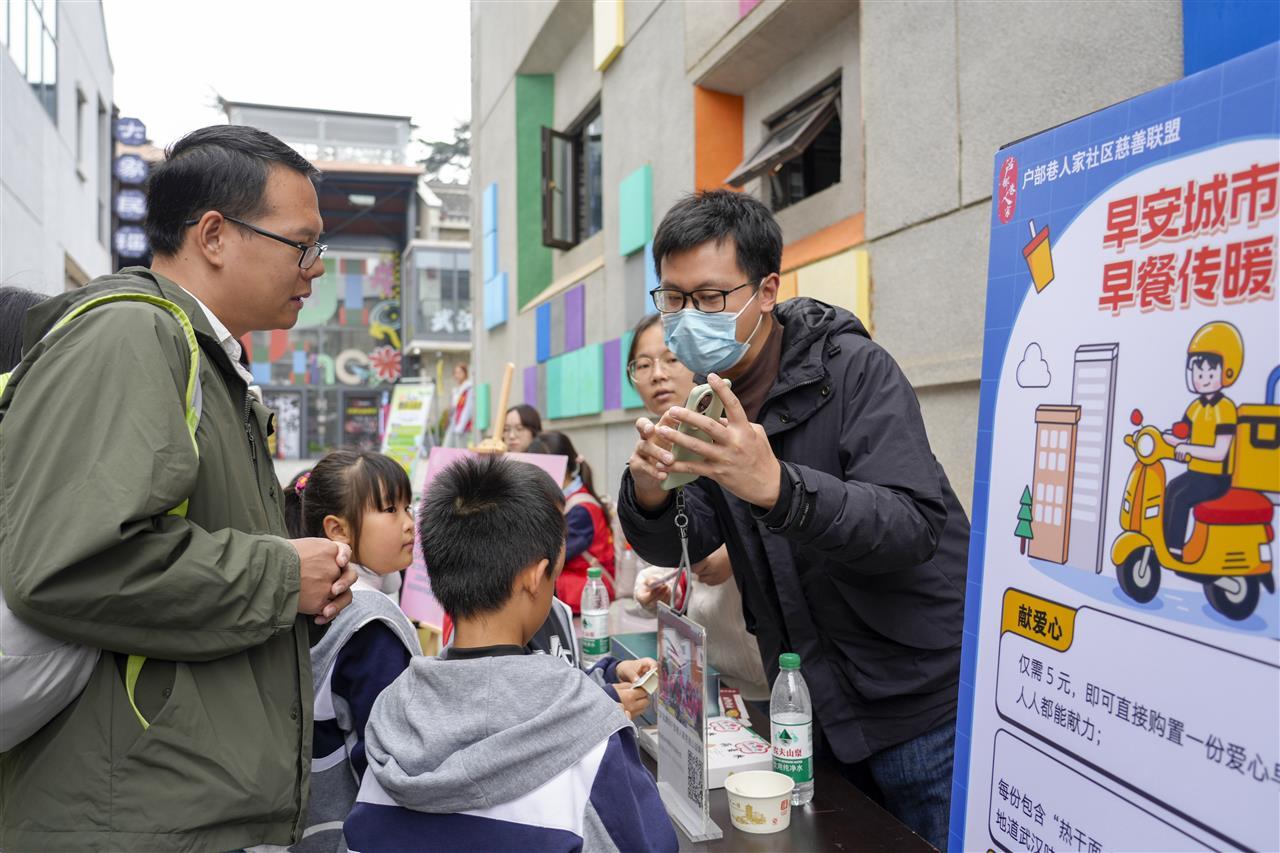 在公益项目推介区,“早安城市”助新行动吸引了众多目光。活动推出了5元/份的爱心早餐券认领项目,所筹资金将为环卫工人、快递员、外卖员等新就业群体购置早餐。在志愿者的热情介绍下,现场居民与游客反响热烈,短短1小时内便认领了80余份早餐券。