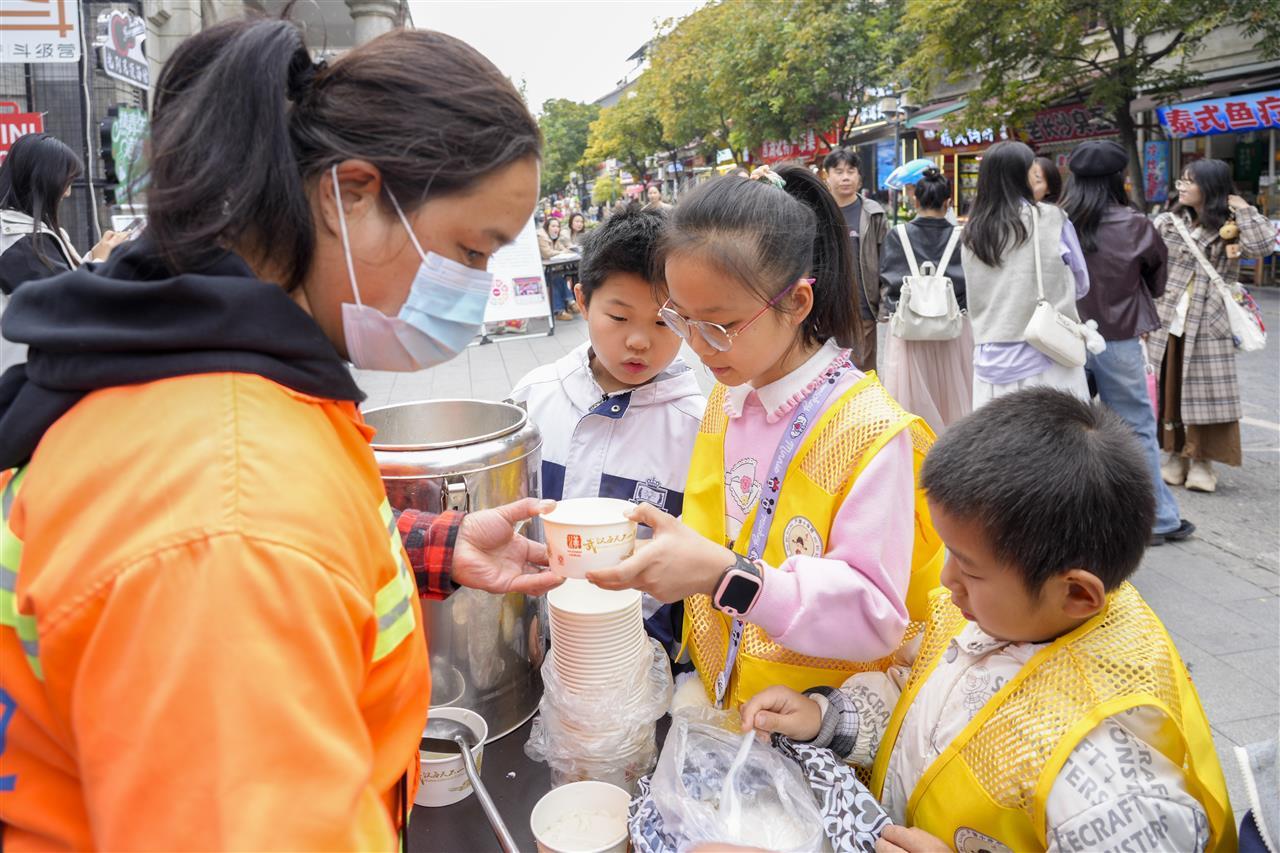 户部巷清洁环卫班长胡明容带领3名环卫工人代表,为现场开展公益活动的志愿者们分发热气腾腾的豆腐脑。雪白的豆腐脑散发出诱人的香气,弥漫在整个街区。这碗饱含感激之情的甜汤,被一一送到“户部小侍郎”“户小青”等户部巷志愿服务者的手中。
