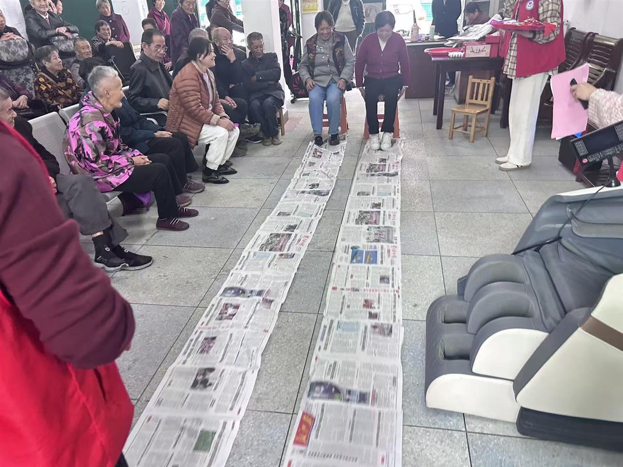 “旧报纸上跑步”模拟登高的趣味游戏,让现场变成欢乐的海洋。夕阳红志愿者示范游戏动作,确保老人参与时既安全又尽兴。比赛开始后,老人们踩着报纸快速踏步,张女士反应敏捷,战胜对手,下台时还俏皮地说:输赢不重要,大家一起玩得开心才最值!