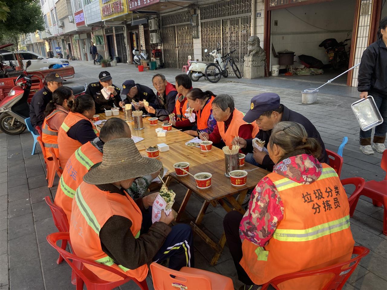 环卫工人在吃爱心早餐