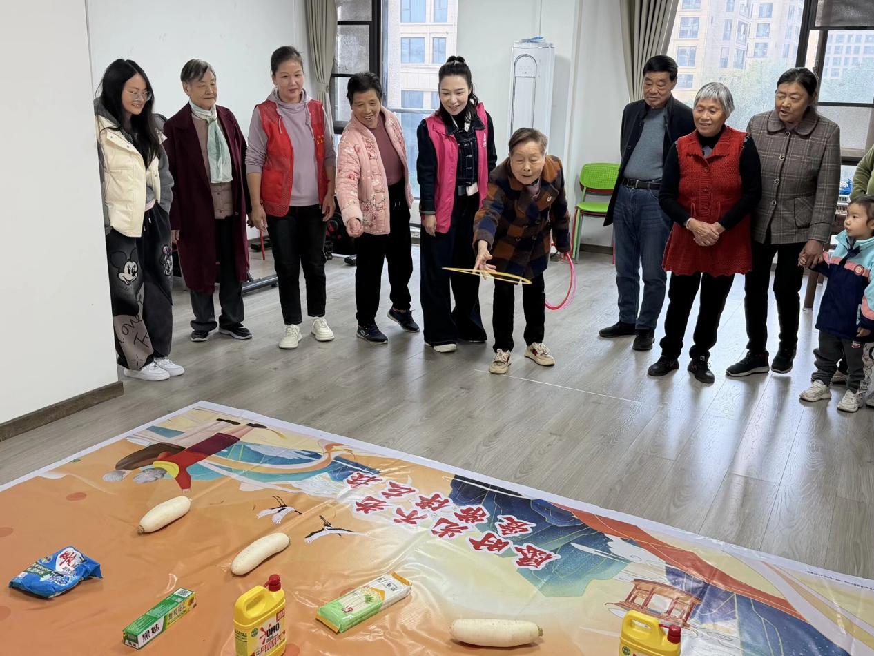 游戏区准备了白菜、萝卜等新鲜瓜果蔬菜作为“奖品”,老人们排起队伍,手持套圈凝神瞄准、精准投掷,现场不时响起欢呼声与笑声。套中奖品的老人满脸喜悦,未套中的老人也毫不气馁,现场氛围轻松愉快。