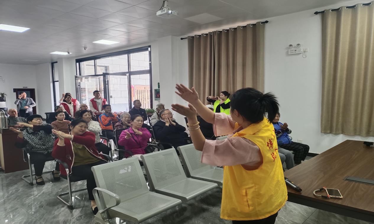 热闹的热身之后,活动进入了温馨的“重阳知识小课堂”环节。考虑到秋季是养生的关键时节,社工将专业的秋季养生知识与老年人的日常生活紧密结合,从饮食调理、起居作息、健康运动三个方面进行细致讲解。讲解结束后,社工还现场带领老人们学习了“手指操八段锦”,这套手指操动作轻柔、无需器械,特别适合行动不便的老人。“这个操作太实用了!我腿脚不方便出门,在家就能练,既活动了筋骨又不费劲。”王婆婆跟着做完一套后,高兴地向社工竖起了大拇指。