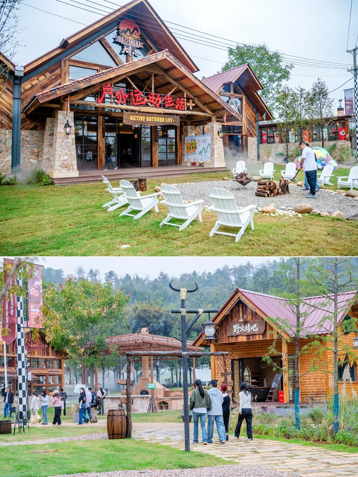 园区以“荒野美学”为设计主题,深度融合“文、体、农、商、旅”,构建了“户外运动、荒野美食、市集零售、演艺娱乐”四大核心集群。