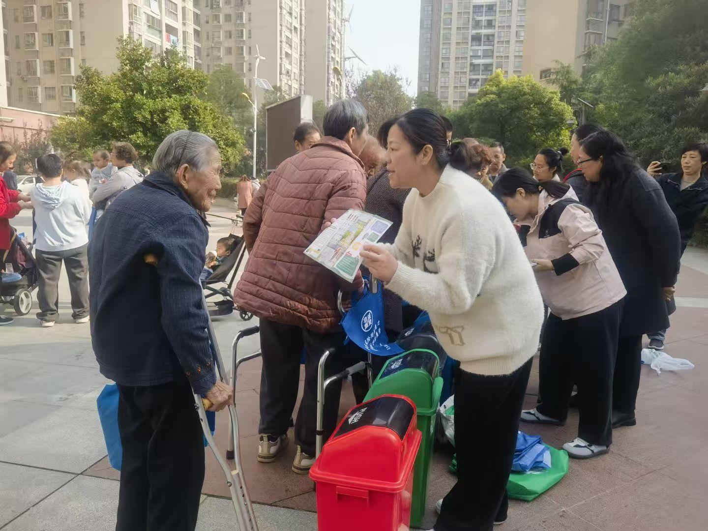在垃圾分类宣传环节,社区还同步设置垃圾分类宣传展台。志愿者通过发放宣传手册、展示分类垃圾桶模型、现场解答疑问等形式,向过往居民讲解大件垃圾处置流程、日常生活垃圾分类标准及投放要求,尤其针对老年人容易混淆的“厨余垃圾与其他垃圾”“可回收物细分”等问题进行耐心指导,进一步强化了居民“分类投放、绿色生活”的理念。