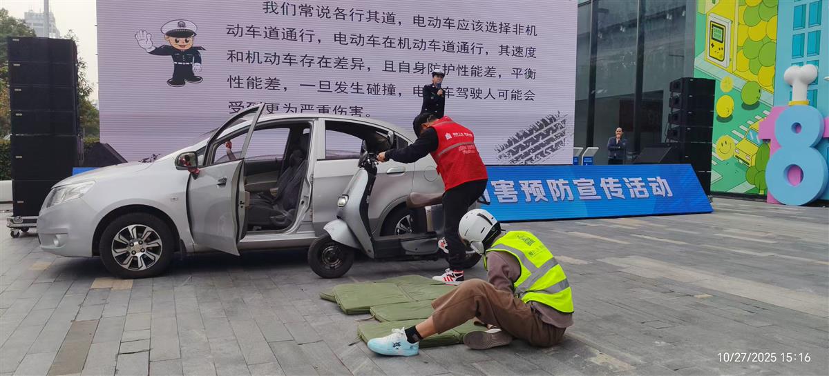 为了让安全知识更加直观,宣传活动特别安排了人员在现场进行电动车突发事故的情景模拟展演,电动车在急刹车时的侧滑、转弯过快的倾覆、遇到障碍物的失控等场景一一呈现,引得台下骑手们发出阵阵惊呼。美团骑手李先生直言:“太可怕了,危险就在瞬间!”彭丽斯通过情景再现形式引导大家主动学习交通安全知识,同时用数据加强记忆:“头盔不是道具,是事故发生时的保命工具——正确佩戴能降低80%的伤亡率。”接着,她现场讲解头盔的正确戴法,纠正“戴而不系”的常见误区。