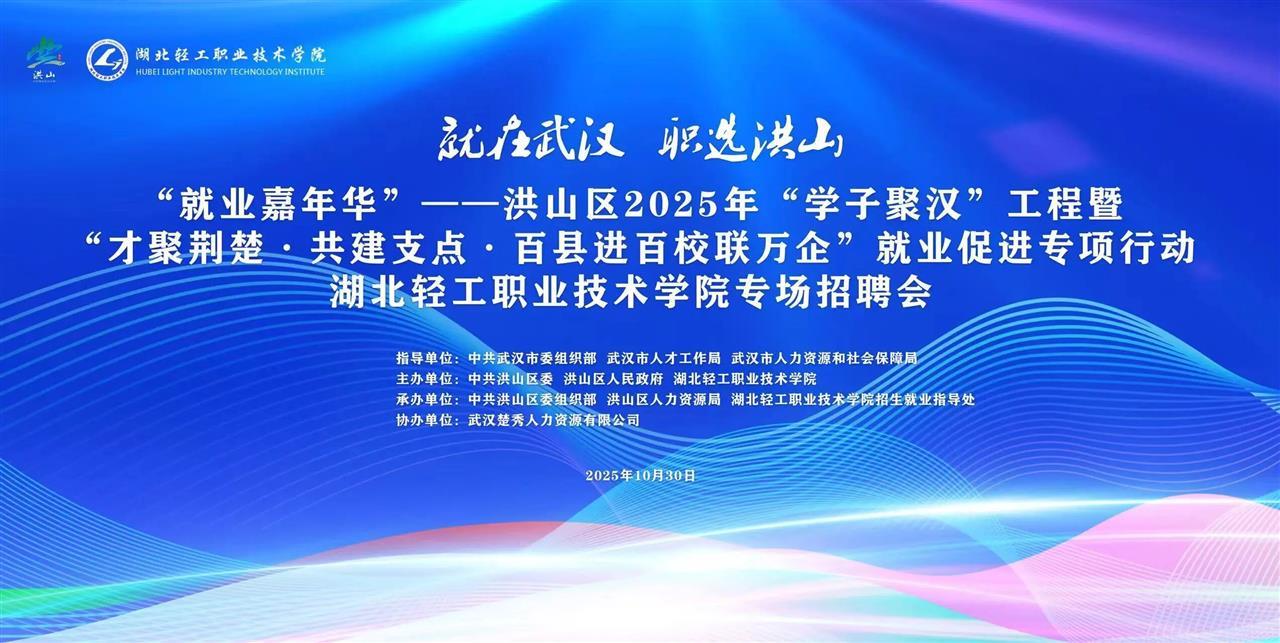 就在武汉,职选洪山!技能成就梦想,名企助你启航10月30日(星期四)14:00-17:00“大学之城就业嘉年华”——湖北轻工职业技术学院专场招聘会将在湖北轻工职业技术学院篮球场举行。