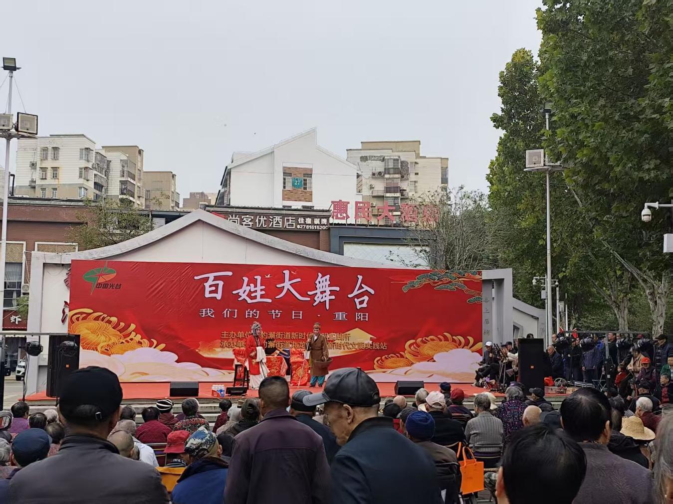 10月27日,由武汉东湖高新区豹澥街道新时代文明实践所主办、九龙湖社区新时代文明实践站承办的“我们的节日·重阳”暨百姓大舞台活动在九龙湖社区文化广场举行。该戏曲贺重阳主题活动,吸引了近百名老年居民积极参与。
