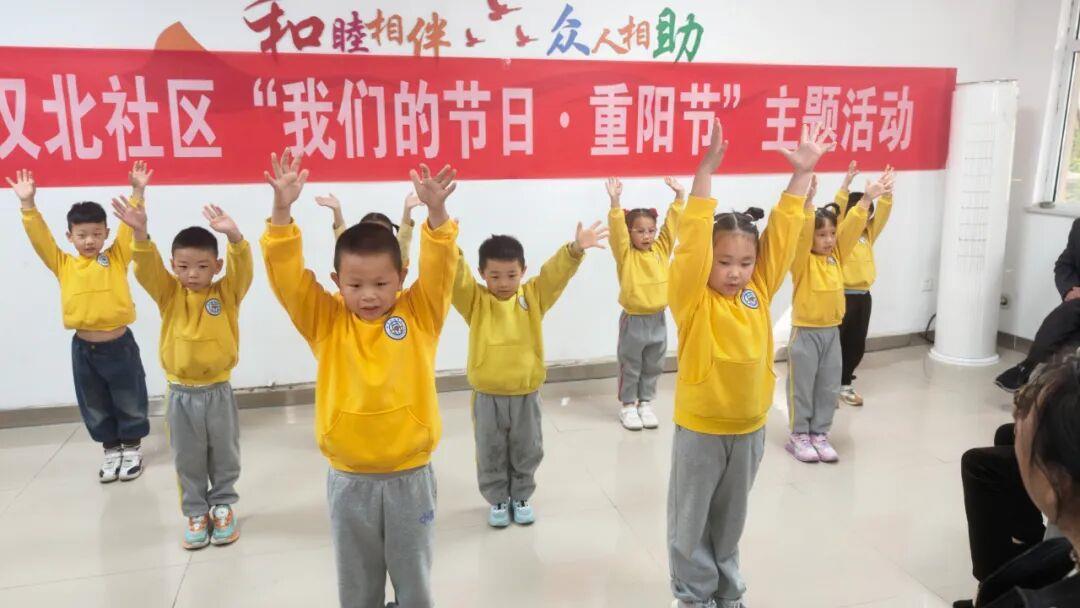 汉北社区联合晶晶幼儿园开展“童声颂暖重阳日”活动,小朋友们献唱《半生雪》为爷爷奶奶送祝福。东风社区联合长江工程职业技术学院学生志愿者,与老人结对参与猜歌比赛,默契配合赢得阵阵掌声。