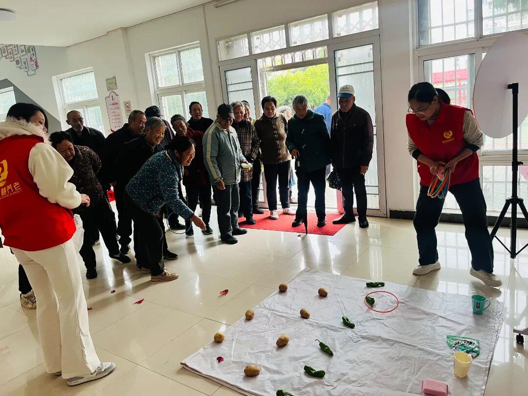 新桥社区开展“重阳趣味‘丢’惊喜”活动,老人们通过投掷游戏赢取蔬菜、洗衣粉等实用物资。青龙社区设置蔬菜套圈圈游戏,老人们踊跃参与,在欢乐中收获新鲜食材。汉北社区创新推出“福签盲盒”“敬老版成语接龙”等互动环节,让现场热闹非凡。