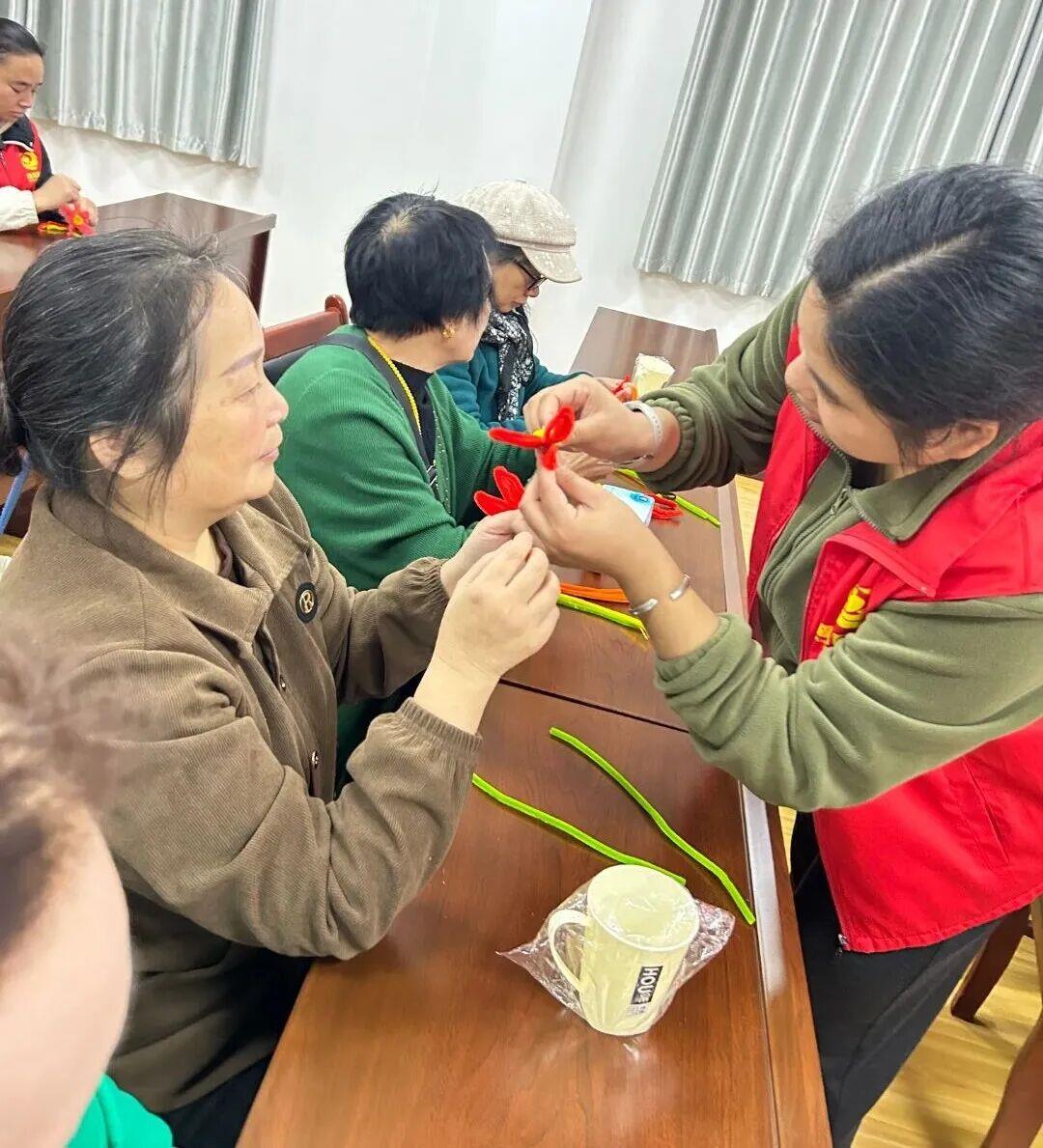 滨湖社区、东风社区均设置了扭扭花手工DIY环节,老人们在志愿者指导下,将五彩扭扭棒变成一朵朵逼真的向日葵、康乃馨。工贸社区走进同寿堂颐养院,带领老人们巧手生花,用扭扭棒制作出朵朵“心意”,欢声笑语充满整个院落。