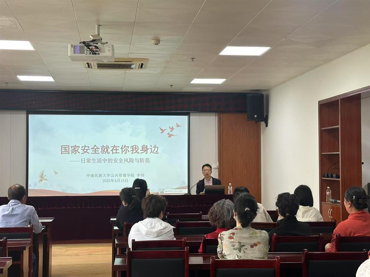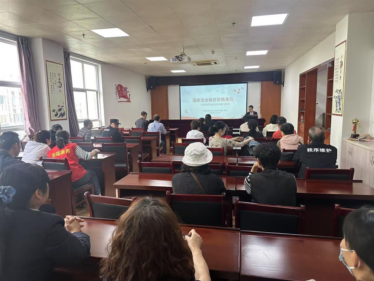 4月15日,民大社区举办全民国家安全教育日活动。活动室内座无虚席,中南民族大学公共管理学院李伟老师正为社区居民讲解《国家安全就在你我身边》。当天,武汉市公安局东新分局的民警们来到现场,通过反邪教图片展和反恐防暴演练,让居民们在实践中提升安全意识。