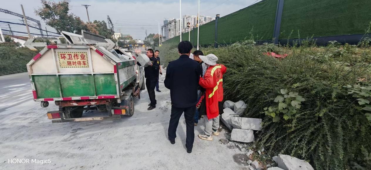 事发当天,慈惠街综合执法中心执法队员巡查至临空港大道铁路涵洞时,面对半挂货车散落一地的气块砖,执法队员们立即行动。他们一方面在事故现场前后设置安全警示,疏导过往车辆,防止二次事故发生;另一方面,迅速联系辖区环卫公司,请求火速支援。