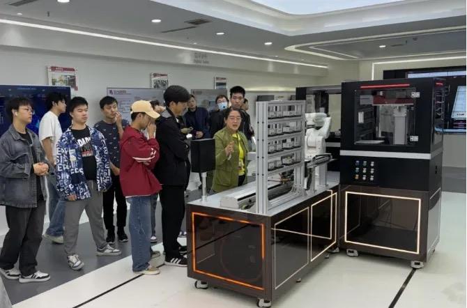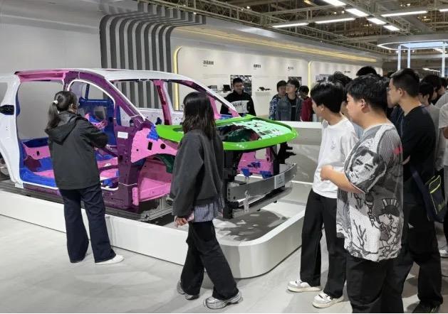 首站来到岚图汽车数字工厂。在高度自动化的总装线上,不同车型、颜色和配置的汽车实现定制化生产,平均每118秒就有一台新能源整车下线。“第一次亲眼见证汽车从零件到整车的全过程,尤其是看到同一条生产线能灵活适配多种车型,让我对智能制造的认知更加立体。”机电工程学院的大二学生饶佳新感叹。