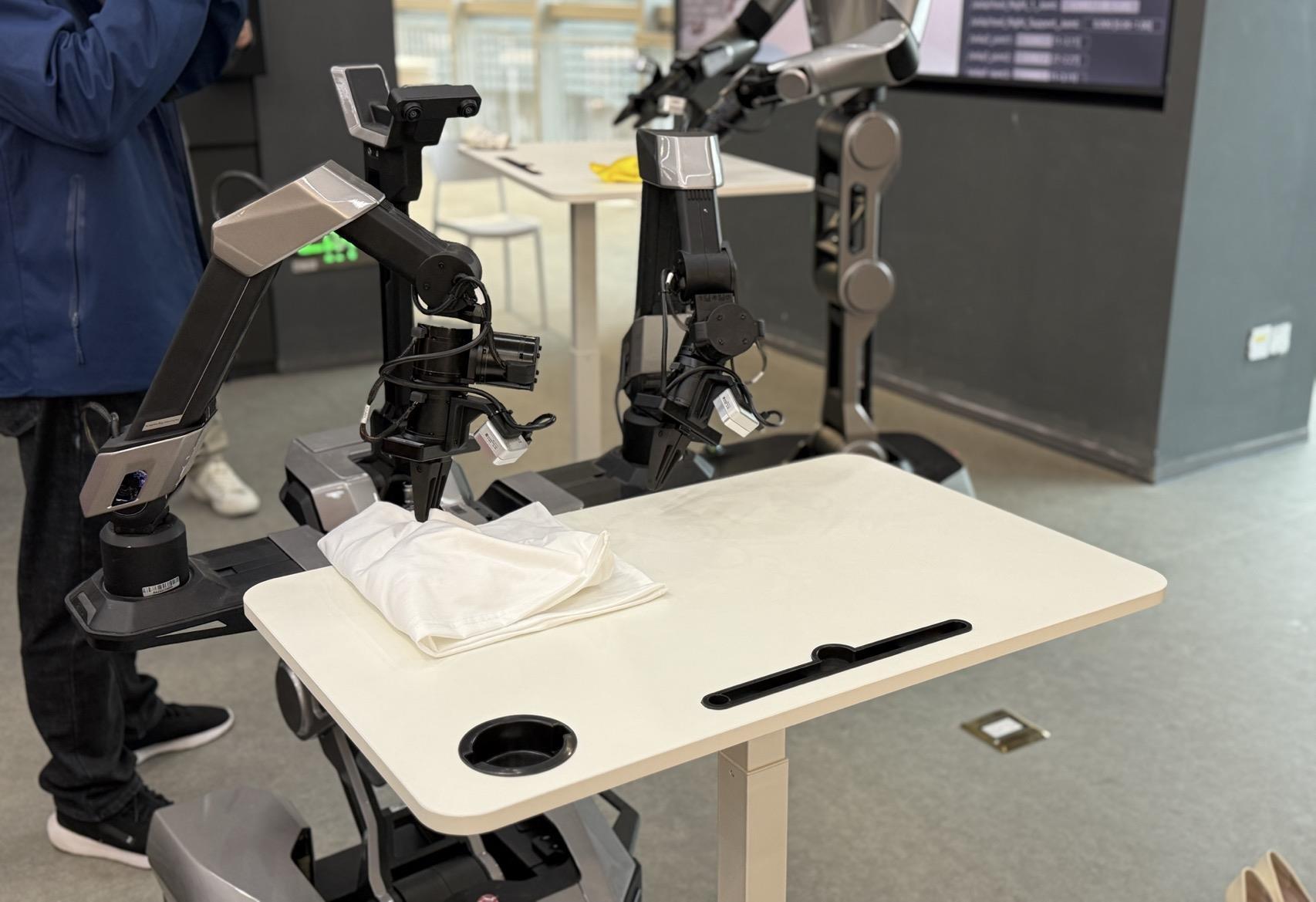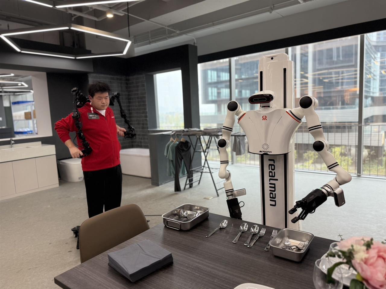在训练现场,数据工程师何展展正面对空无一物的操作区,通过模拟机械臂完成“无实物叠衣”演示。不远处,一台机器人同步模仿他的动作,精准叠起一件白色衬衫。何展展解释说:“我的每一个动作都会转化为数据,机器人通过不断学习这些数据,逐渐形成自己的动作记忆。即便过程中出现错误,也能通过海量数据实现修正与优化。”