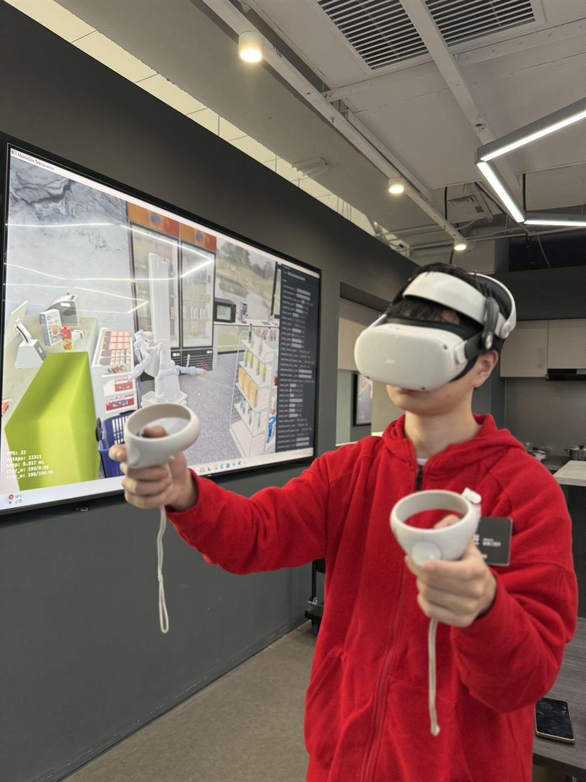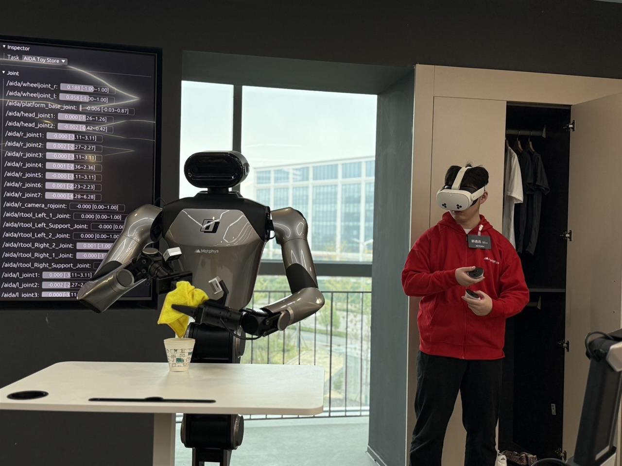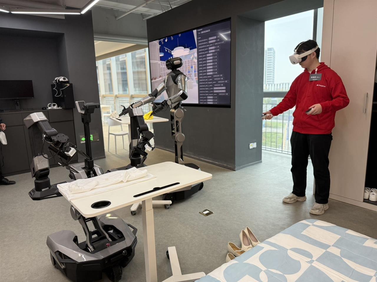 另一边的虚拟仿真训练区内,一位工程师佩戴VR设备,在屏幕上操控机器人完成取货任务。机器人实时记录这些模拟动作,为日后在真实场景中执行任务打下基础。