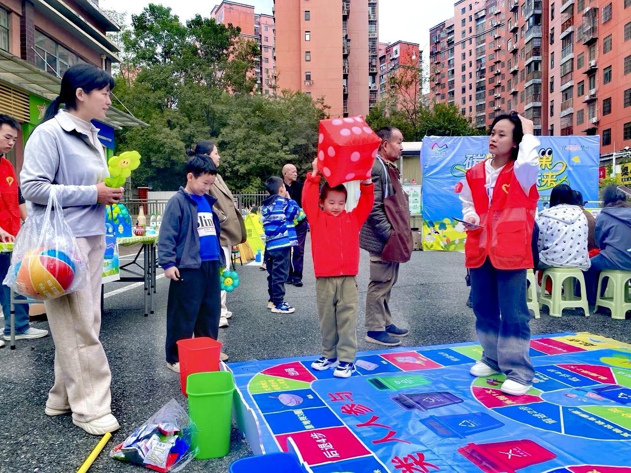 “掷骰子!前进三步!这里是废旧电池,属于有害垃圾。”“回答正确,获得手作体验券。”在环保游戏互动区里,大学生志愿者耐心地引导居民参与“垃圾分类大富翁”游戏,通过互动深化居民对环保的认知。另一边的“垃圾分类投沙包”区,亲子家庭协作投掷,孩子们在家长的指导下分辨垃圾类别,笑声与知识点一同传递。
