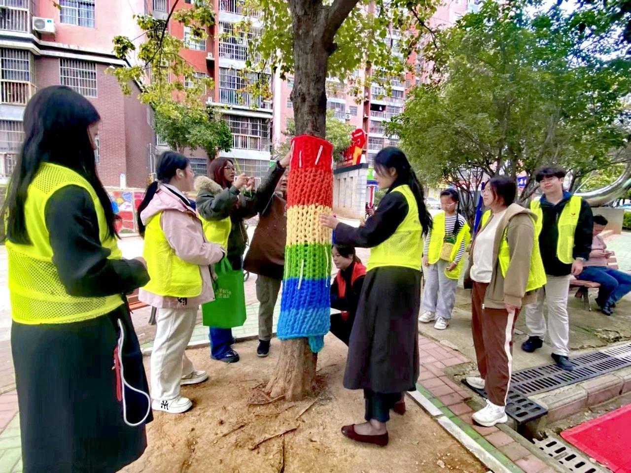 社区“欣悦”编织社利用废旧毛线编织出彩色树围,然后“欣苗”等社区青少年环保志愿队与大学生志愿者一起为社区树木穿上“新衣”,打造的“网红抱抱树”已成为社区环保精神的美好象征。