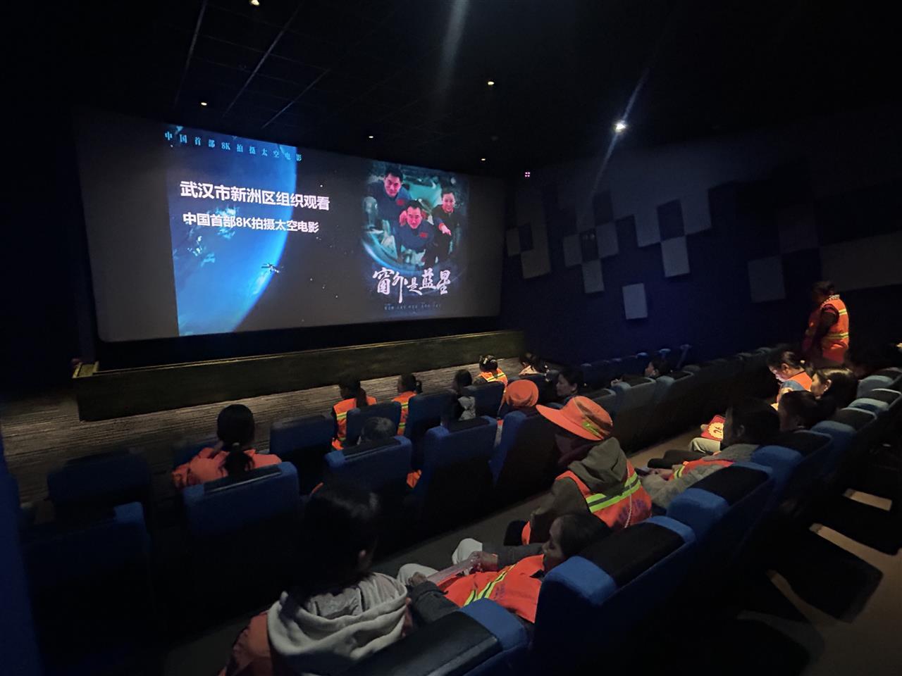 10月30日,新洲区邾城街影城内,中国首部太空纪录电影《窗外是蓝星》准时开映。30余名身着橙色工装的环卫工人坐在最佳观影区,成为当天最特殊的观众。这是新洲区城管执法局为他们准备的专场放映。