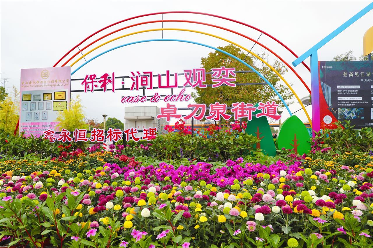 主景设计匠心独运——以“洪山大学之城”标志演化而成的碧水环山构架,以蓝、绿、白三色勾勒出山水相融的意境。地面花卉以粉、紫、橙三色分区,象征多元人才在此汇聚。240平方米的展区内,塔菊耸立、大立菊团簇、精品菊点缀,与砾石小径、云朵造型相映成趣,既是视觉的盛宴,也是洪山人文与自然交融的生动写照。
