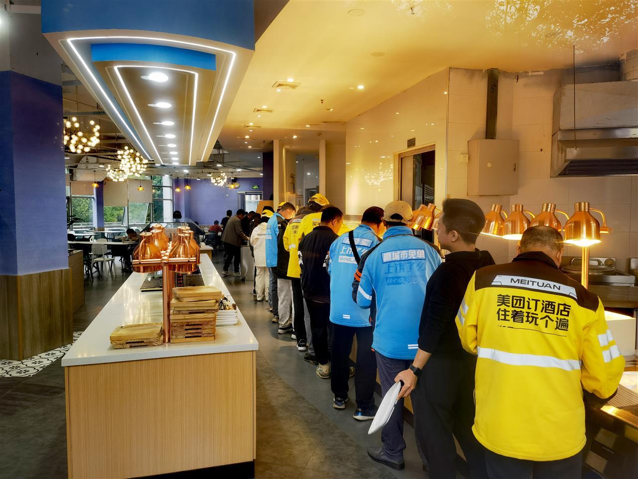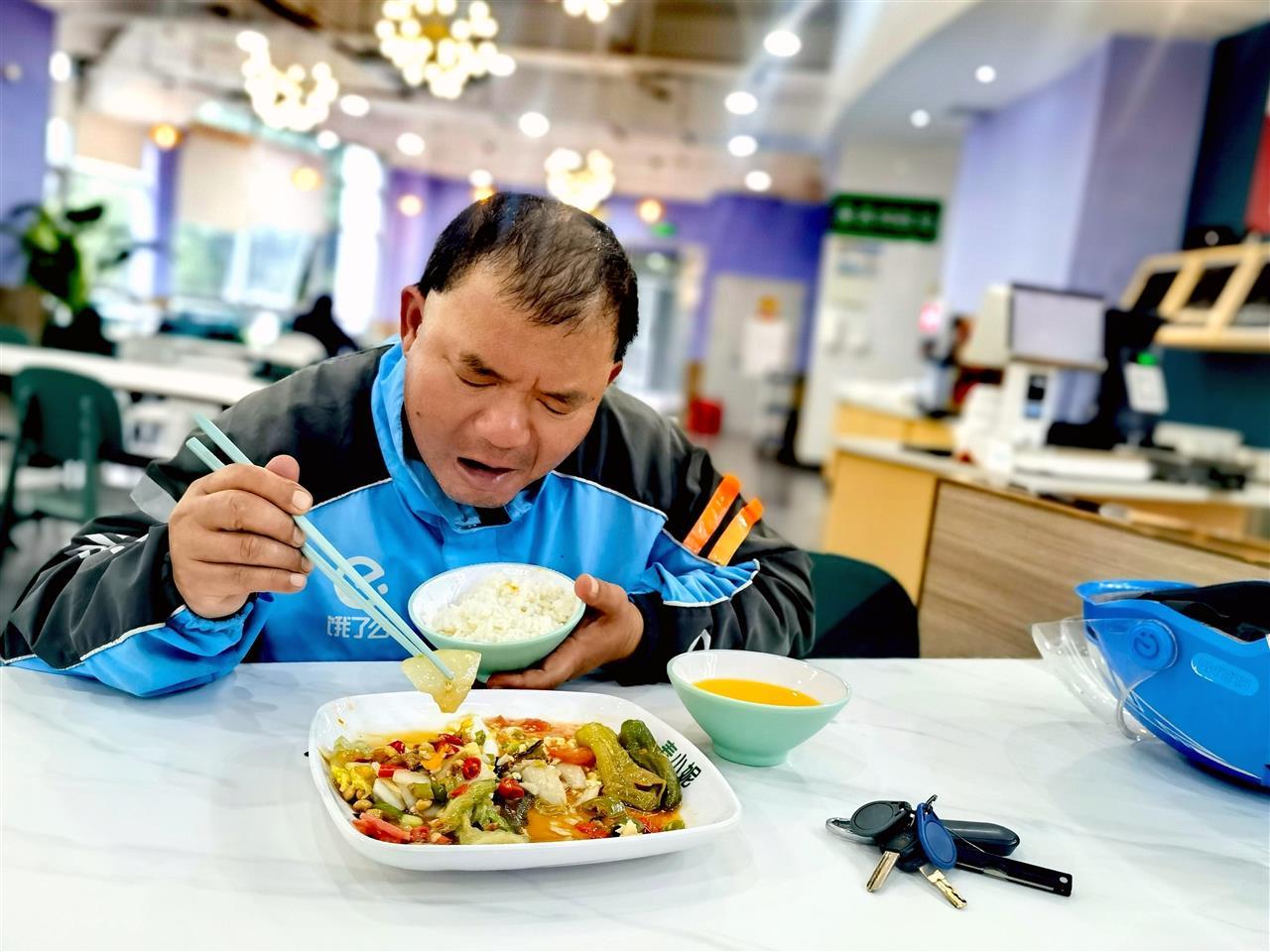 “小哥们素质都很高,他们在外跑了半天,饭量多一些,怕在前面把菜打完了,所以故意拖后在我们餐厅服务员后面的。”张建说,为不影响其他顾客就餐,骑手们自觉避开中午就餐高峰期,吃完后,还会主动把餐盘送到回收处,减轻店员负担。“这种默契是双方自然形成的。”