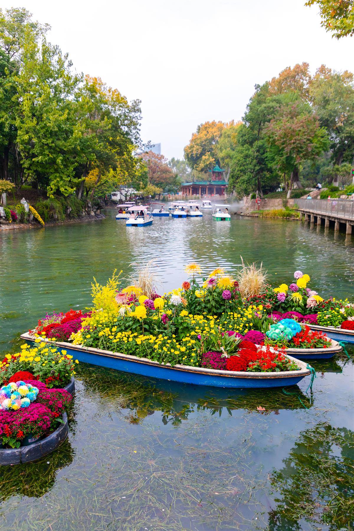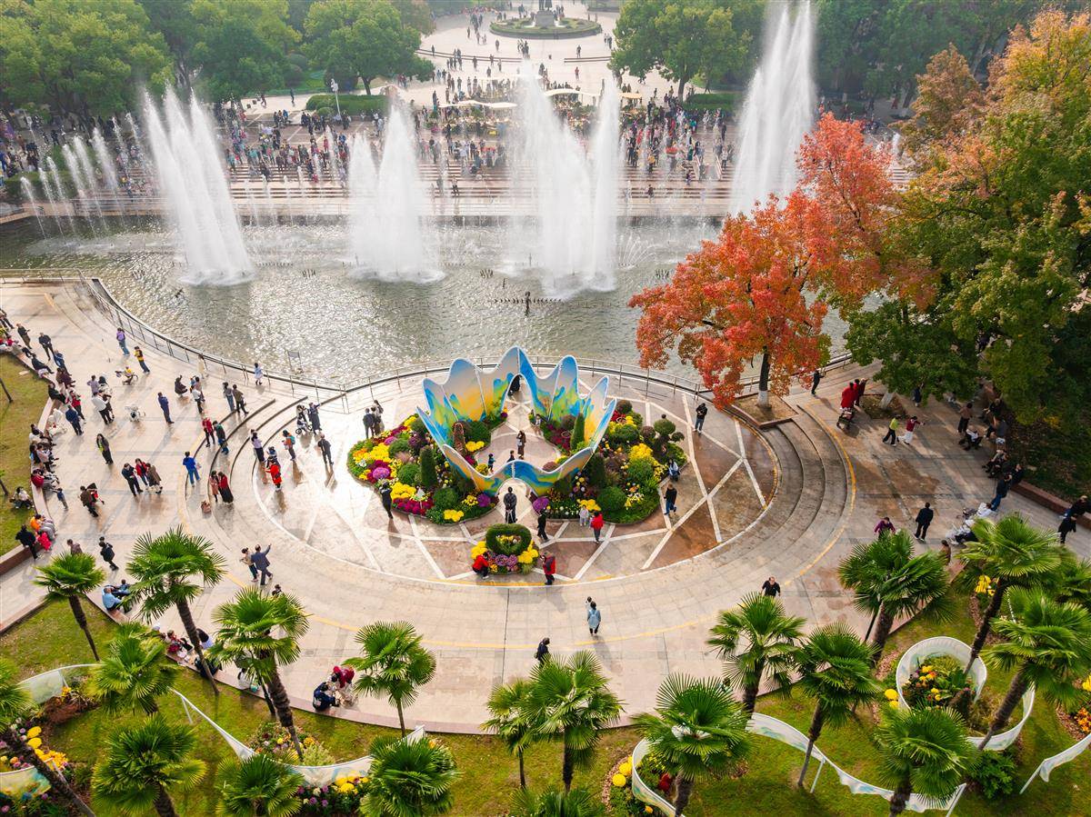 从临解放大道的公园南大门至喷泉广场,一条精彩的赏菊动线将“遇见西园”“漂浮花船”“古色青影”“岛屿花丘”“山河彩绢”等五大核心景观节点“串珠成链”,徐徐展开秋日画卷。