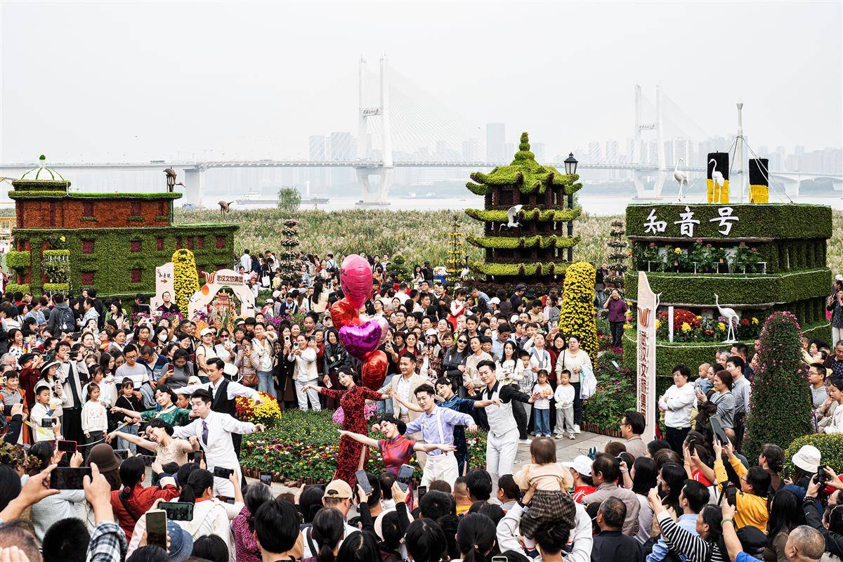 在武汉金秋菊展汉口江滩主展区,知音号演员们带来的舞蹈快闪引得市民和游客驻足围观。(湖北日报全媒记者 任勇 摄)