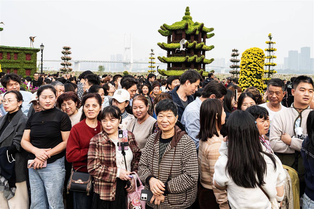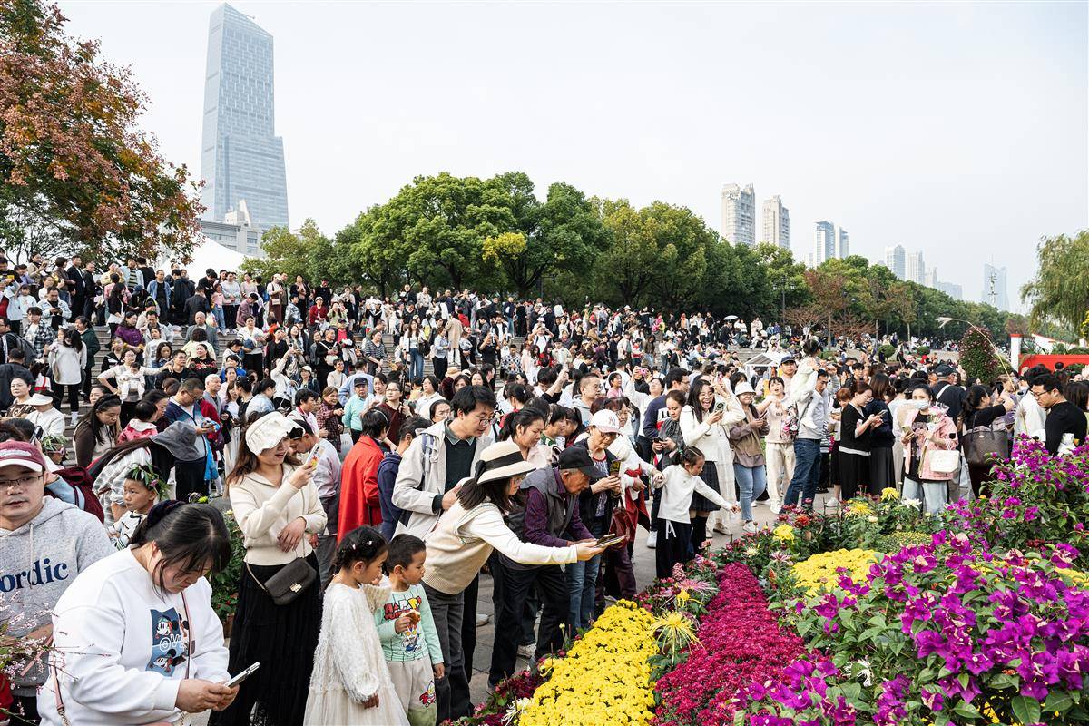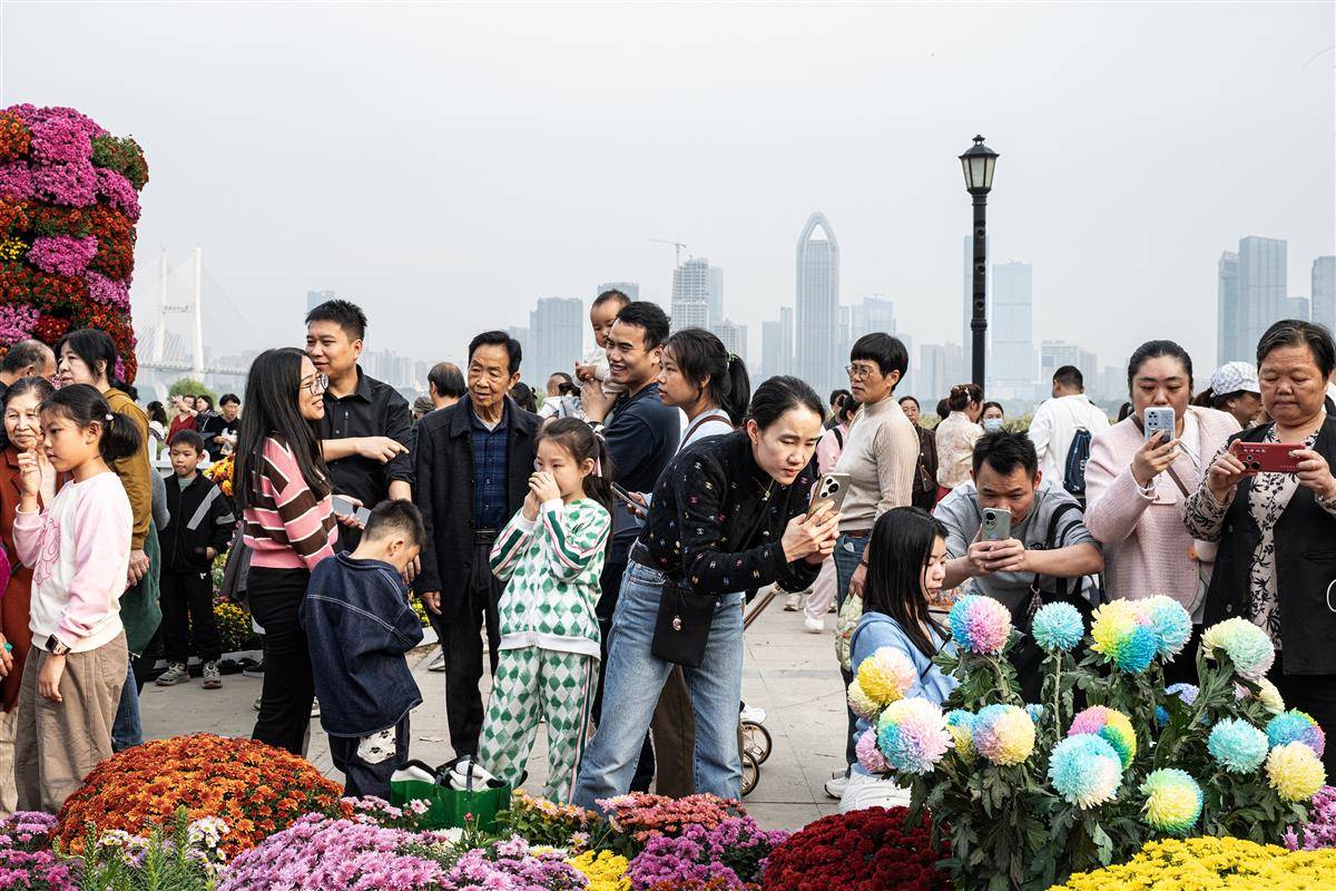 市民和游客在武汉金秋菊展汉口江滩主展区拍照打卡。(湖北日报全媒记者 任勇 摄)