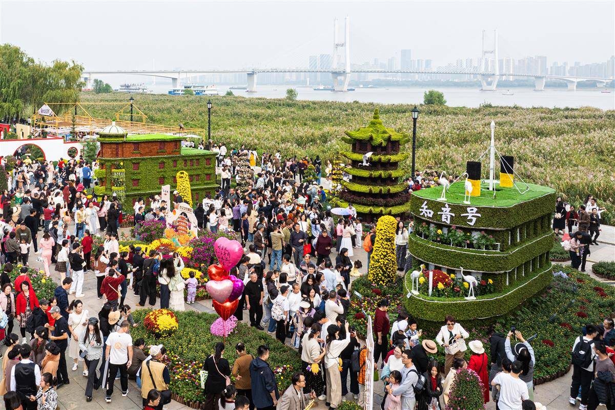 11月1日,在汉口江滩主展区,黄鹤楼、巴公房子、知音号等融合城市地标元素的菊花造型,引得市民和游客纷纷前来拍照打卡。(湖北日报全媒记者 任勇 摄)