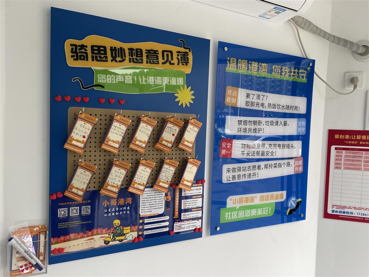 新闻记者来到武汉东湖高新区佛祖岭街道金融港社区党员群众服务中心,看到这里开设了“小哥港湾”。社区干事万梅告诉记者,“小哥港湾”是今年7月启用的,为广大户外工作者提供免费座椅、饮用水、手机充电、Wi-Fi、应急药品、防暑防寒物资等,备有雨伞雨衣、简单维修工具、打气筒、便签纸等供户外工作者使用,还提供卫生间,解决他们“如厕难、休息难”的问题。