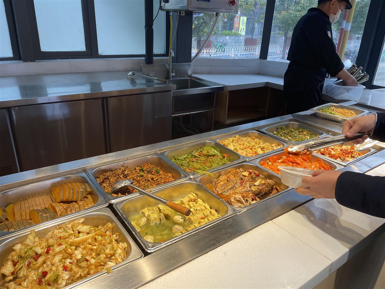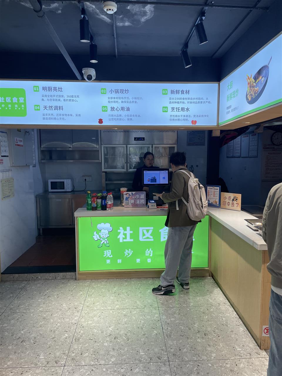 在武汉东湖高新区华翔社区食堂,这里摆放着“小哥食堂”的展架。华翔中心客服经理张喆告诉新闻记者,这个食堂为自助餐,品种丰富、价格也实惠,每到中午时分,写字楼里的许多人前来就餐,价格也比较实惠,还引进了商户渔火的厨师原班人马为食堂制作餐食。