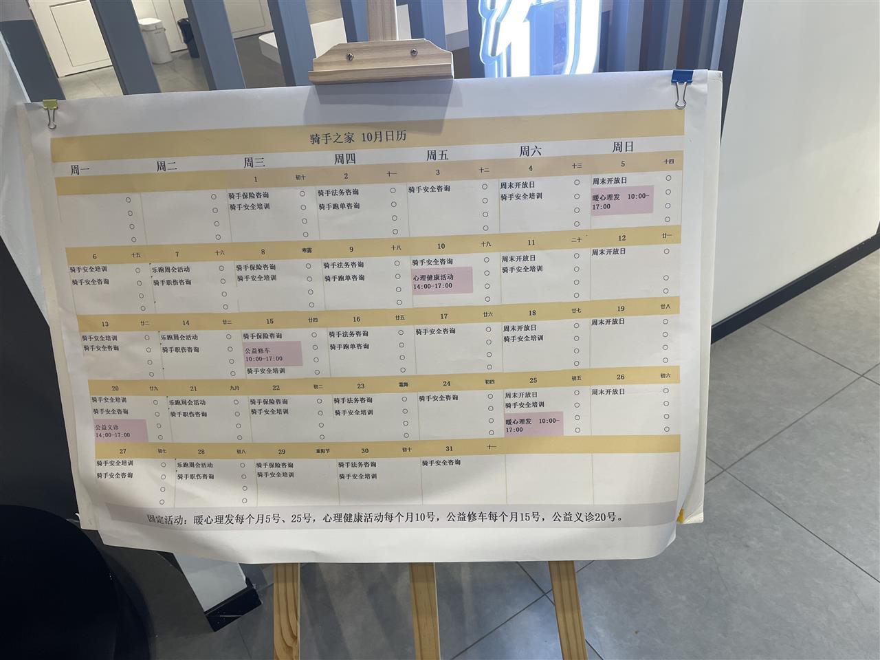 记者看到,“骑手之家”的前台附近摆放着展架,“骑手之家”的日历上展示着今年10月份开展的各项活动。