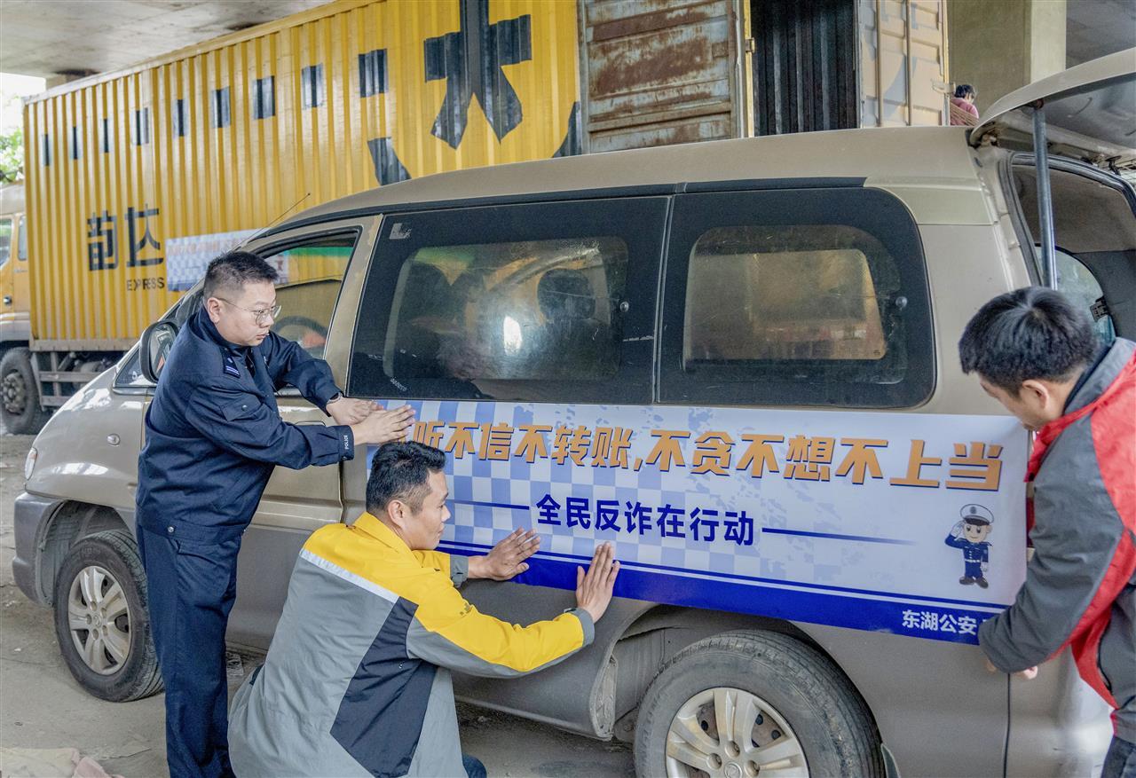 “我开的车成了东湖公安的反诈宣传车!”10月31日,驾驶着韵达快递车的王师傅高兴地展示车身上张贴的反诈宣传标语。目前,印有“不听不信不转账,不贪不想不上当”的快递反诈宣传车已有45辆,正成为东湖风景区周边公路上一道独特的“反诈风景线”,将安全提醒送到群众身边。