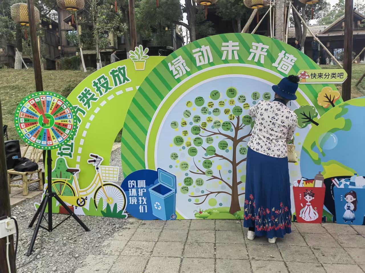 在景区核心区域,一面“绿动未来承诺墙”吸引众多游客驻足。游客们使用特制的环保可降解笔,在绿叶形状的便签上写下自己对践行垃圾分类、爱护景区环境的承诺,并亲手将“绿叶”粘贴于象征生命与希望的背景树上(见下图)。“我家每天做好干湿分离”“垃圾变废为宝,分类必不可少”“我要帮助垃圾找到自己的家”一张张充满诚意的留言,一片片汇聚成荫的“绿叶”,不仅承载着游客对绿色生活的共同向往,也成为一份独特而珍贵的旅游纪念。