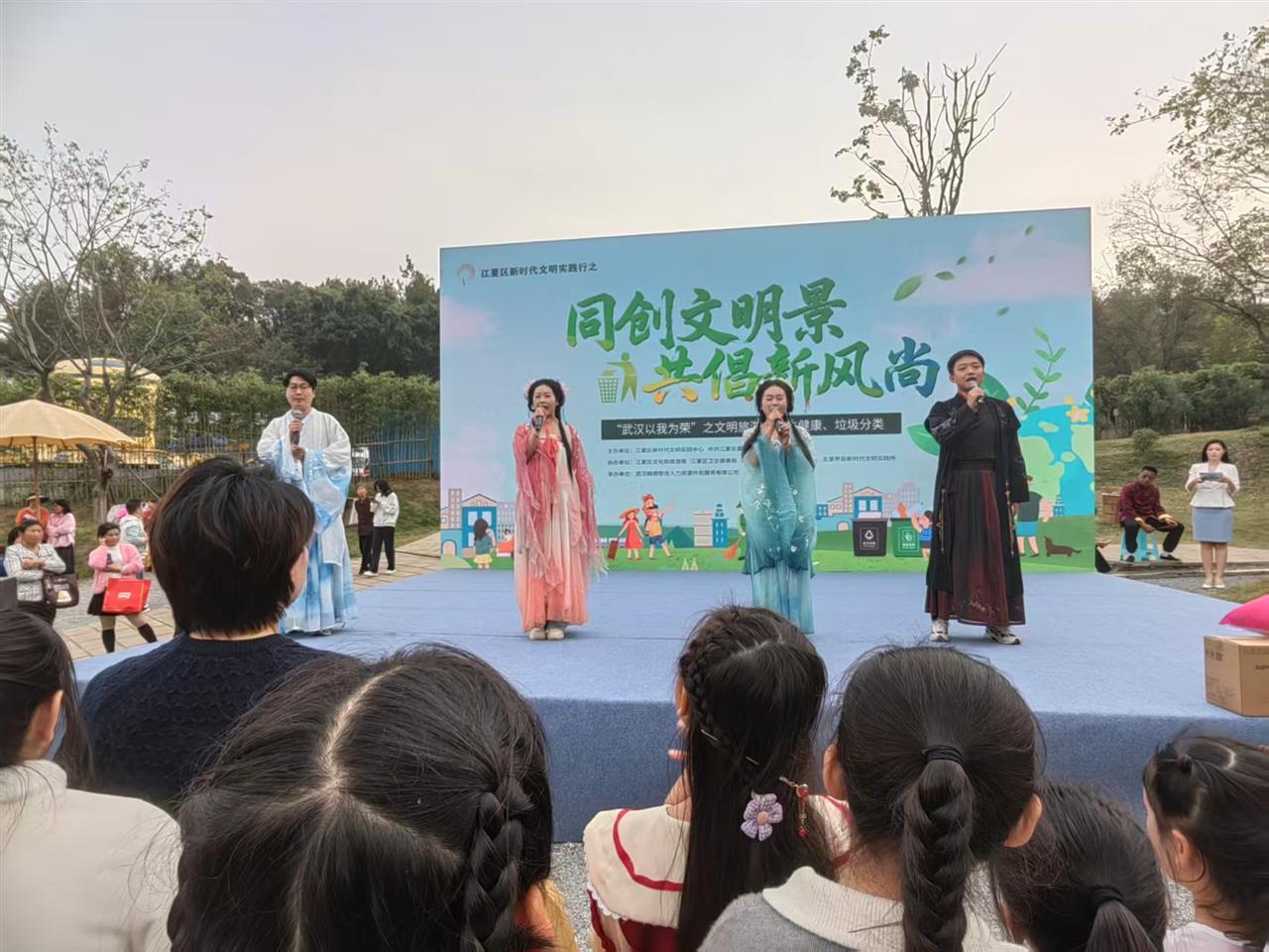 活动现场,主舞台区节目精彩纷呈。原创歌曲《大美江夏》深情唱响,三句半《普法宣传》诙谐生动,说唱节目《垃圾分类》节奏明快、朗朗上口,穿插其中的有奖问答环节更是点燃了观众的参与热情,“吃完的外卖餐盒(残留少量汤汁),正确处理方式是?”“吃剩的米饭、鸡骨属于什么垃圾?”这些贴近生活的问题,在轻松愉快的氛围中传递着科学分类的知识。