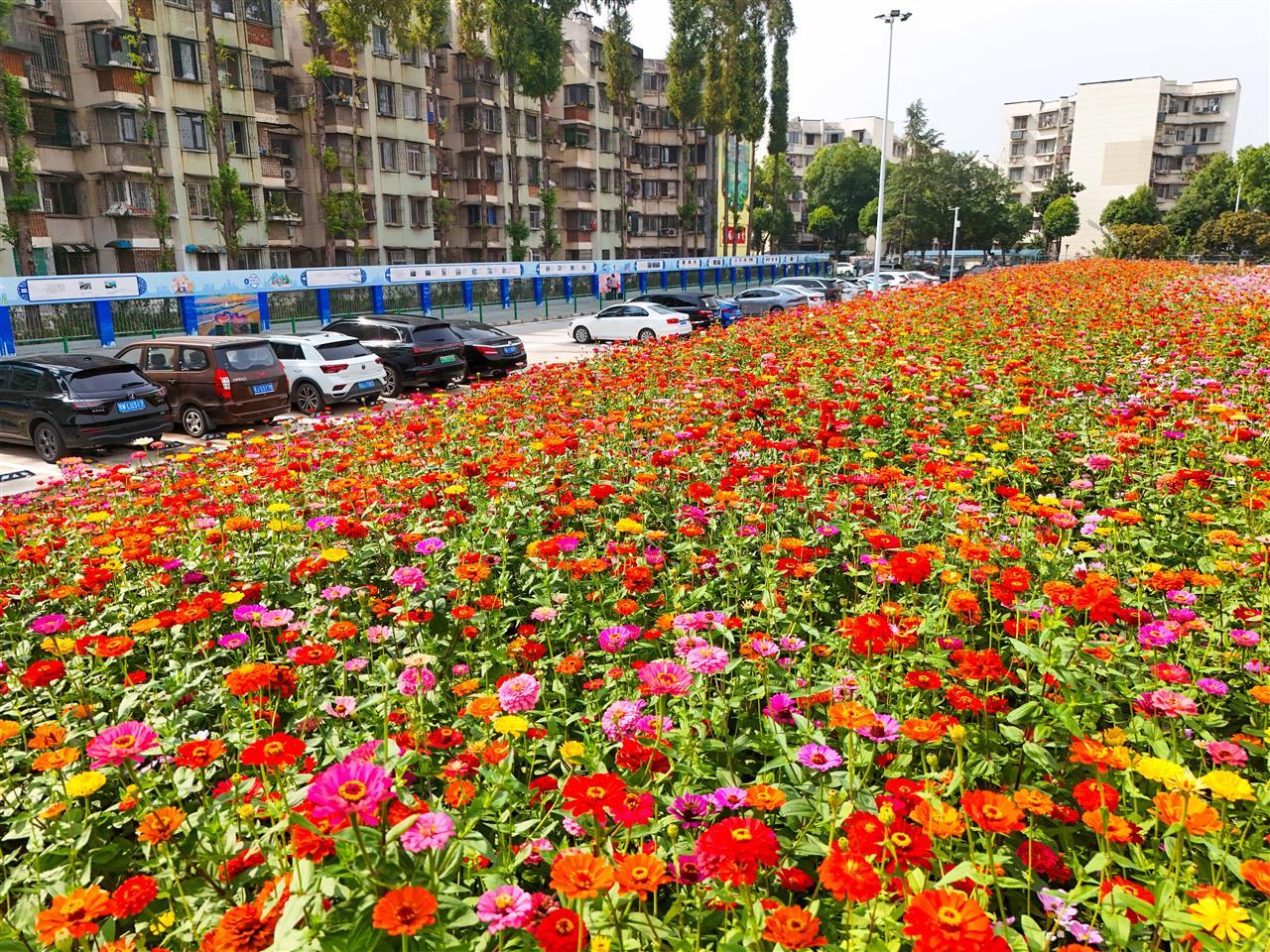 新闻记者现场看到,4000平方米的百日菊组合正争奇斗艳。沿着这片花田停放的私家车,犹如停在花园里,让人赏心悦目。一条3米多宽的通道,从居民楼延伸到周边的菜场、公交站、夜市和购物场所。