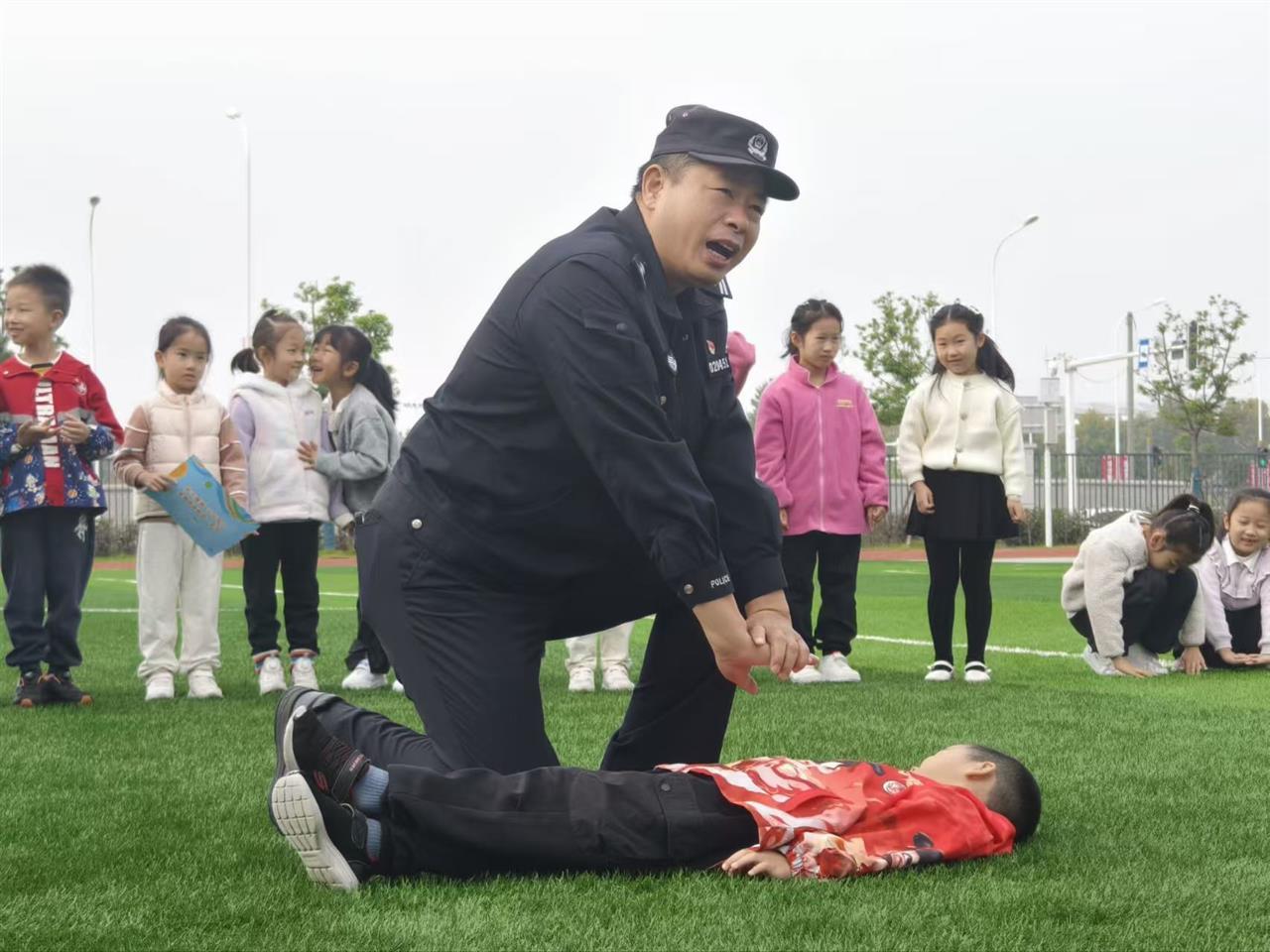 消防员讲解结束后,武汉经开区公安分局沌口派出所民警段永强无缝衔接,开启多维度安全科普。他结合真实案例,围绕防校园事故、交通事故、防一氧化碳中毒、防淹亡等关键领域展开宣讲,用贴近校园生活的场景敲响安全警钟。随后,民警现场演示海姆立克急救法与心肺复苏术,手把手指导同学们模拟操作,互动中让急救知识深入人心。活动尾声,民警还针对校园诈骗风险,发放防诈骗宣传单,进一步织密校园安全防护网。