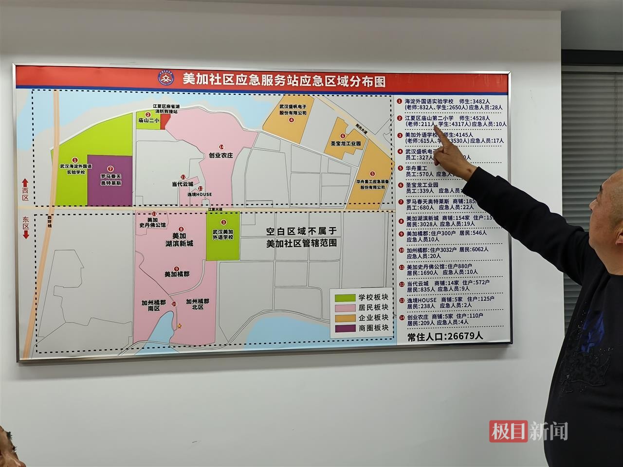 美加社区地处武汉市江夏经济开发区庙山产业园,常住人口约2.7万人,社区内高端住宅与高新技术企业产业园区交错分布。为优化管理效能,社区以江夏大道为界划分为东、西两大区域,进一步细化为居民区、学校、企业、商圈四大板块。这四大板块涵盖7个小区、3所院校、3个工业园区及1个商圈。