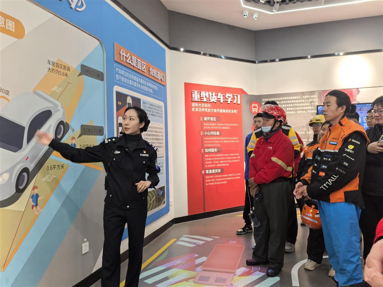 活动伊始,车辆管理所民警陈丹带领骑手们参观了交通安全教育基地。在约半小时的参观过程中,骑手们通过实物展示、案例分析等形式,直观地了解了交通事故的危害以及遵守交通规则的重要性。陈丹详细介绍了各类交通安全知识,让骑手们对交通安全有了更深刻的认识。